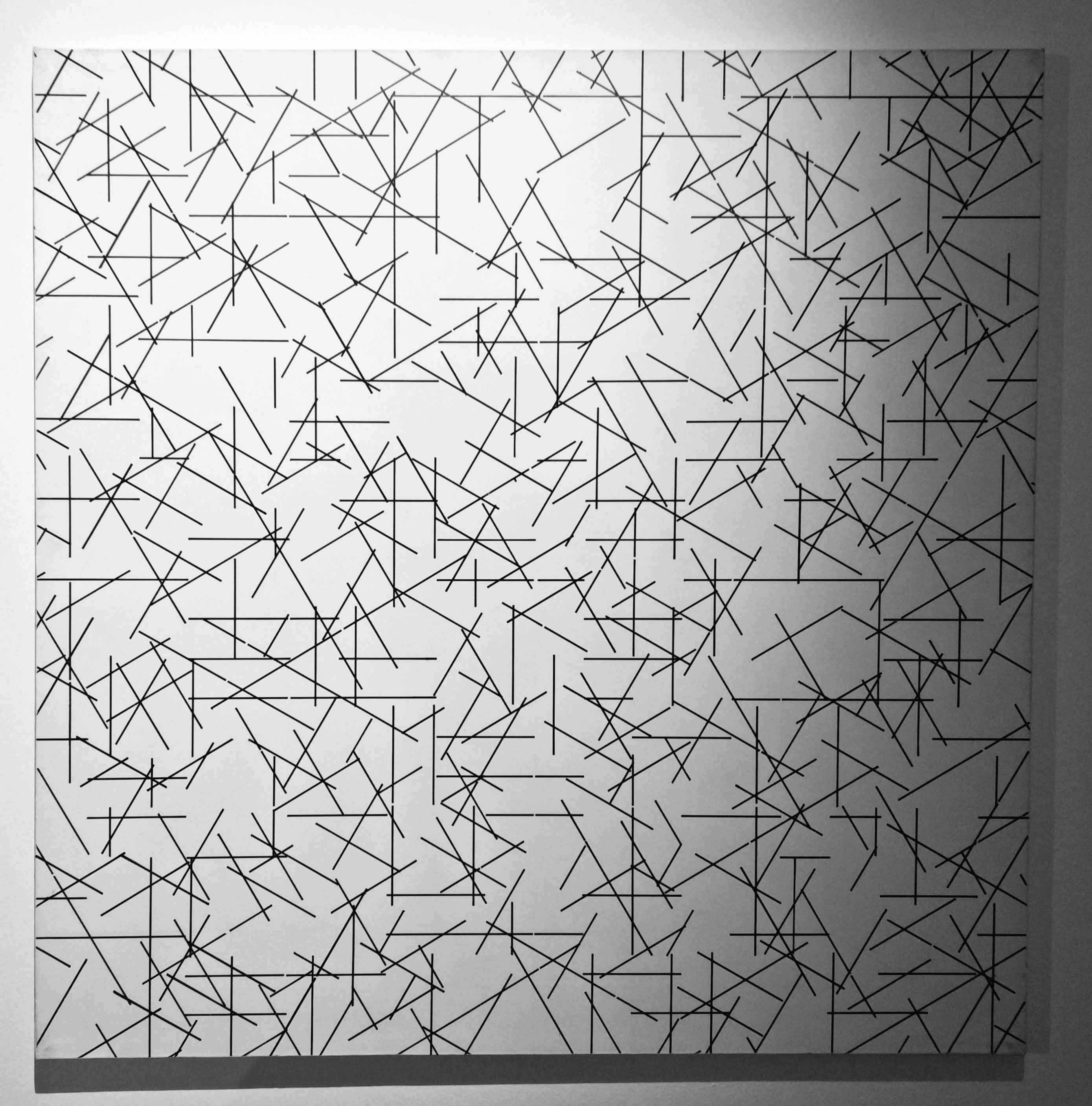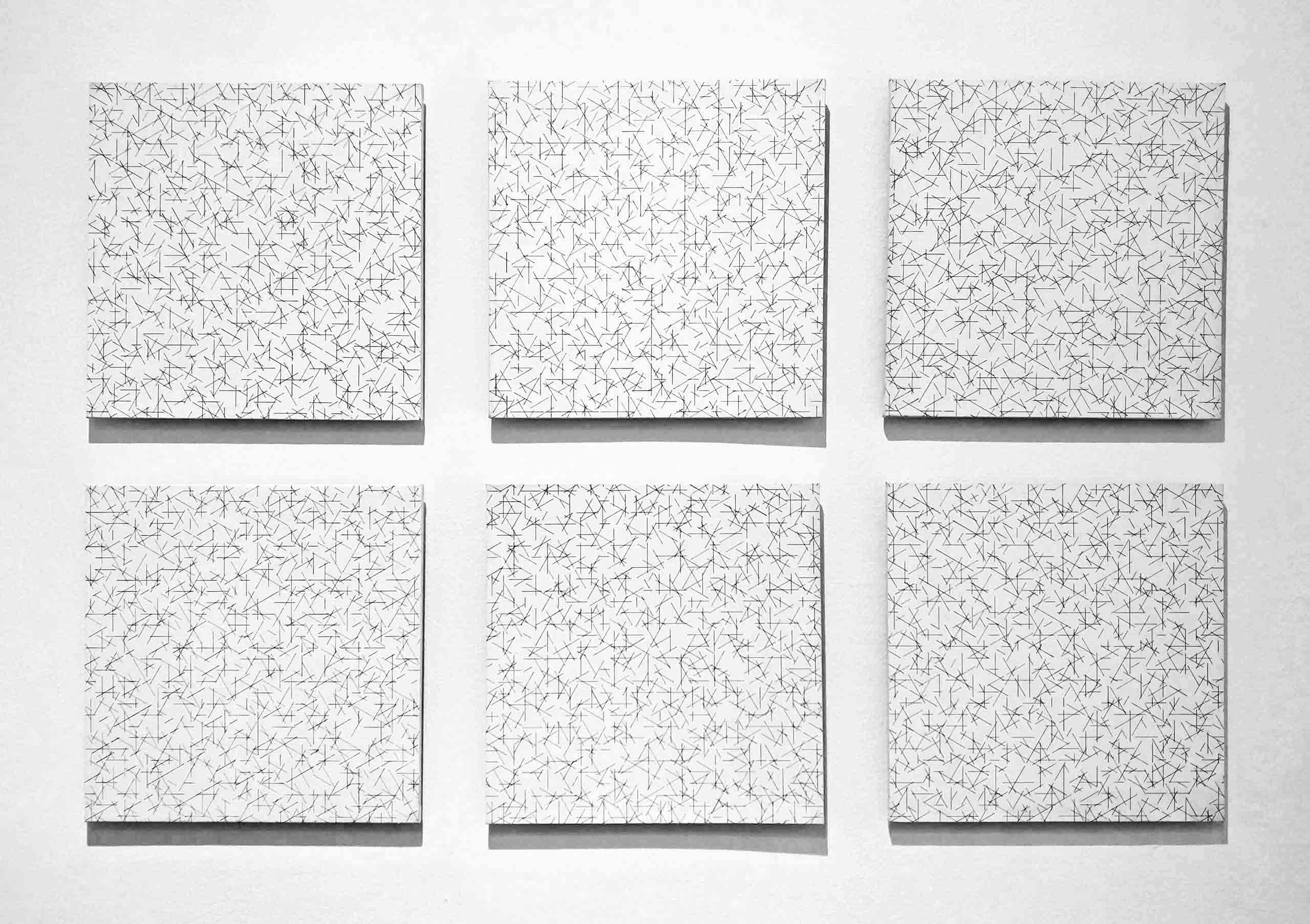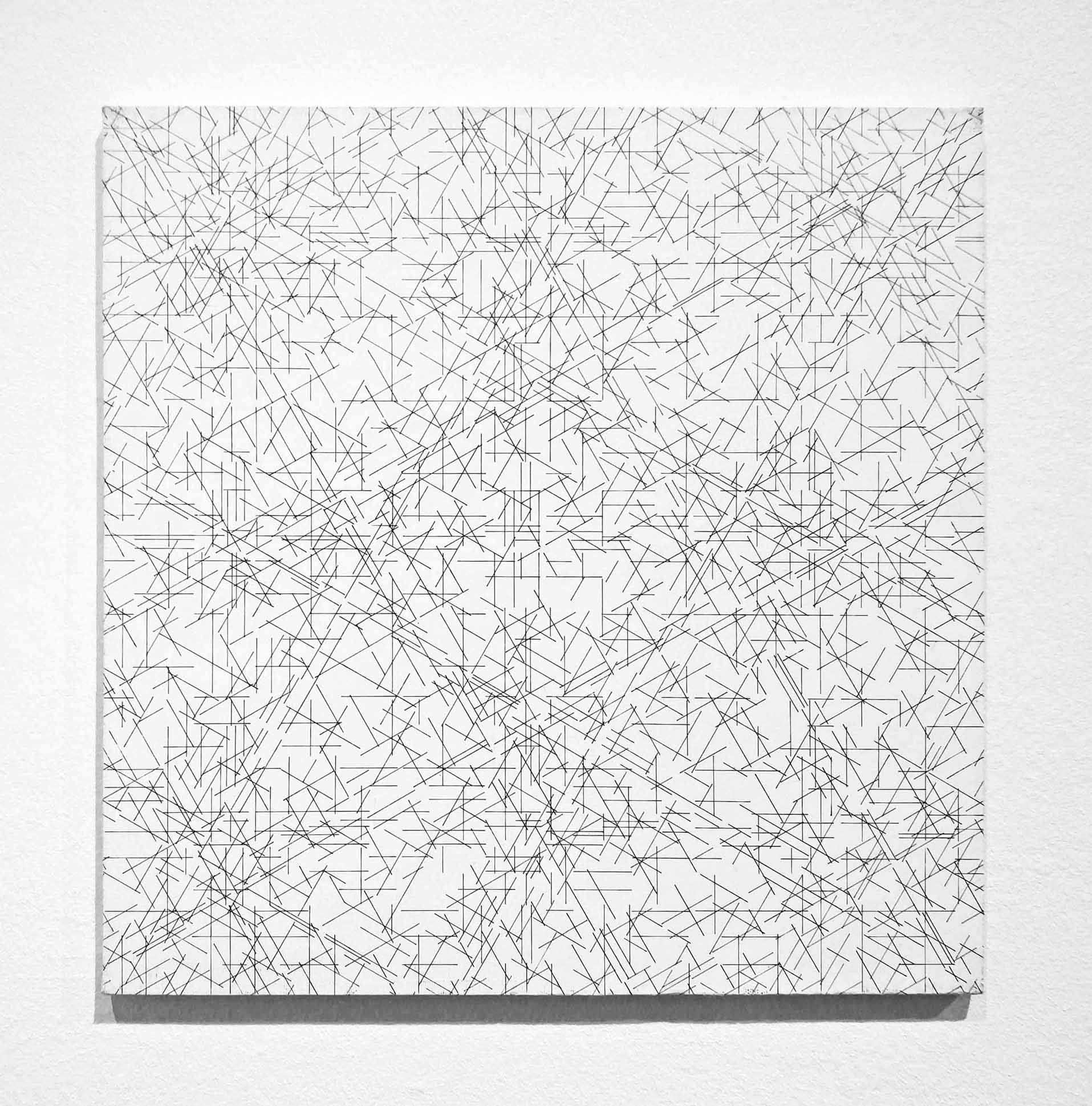 Comparable chaotic impressions are given by the quadratic Line images, but they are designed by complicated algorithms fed by numbers that are randomly determined via dice throwing. First Zilocchi created a logical made grid on the painting ground and calculated with these random numbers the points where his lines lie in between. The result is a complex structure, difficult to decipher.