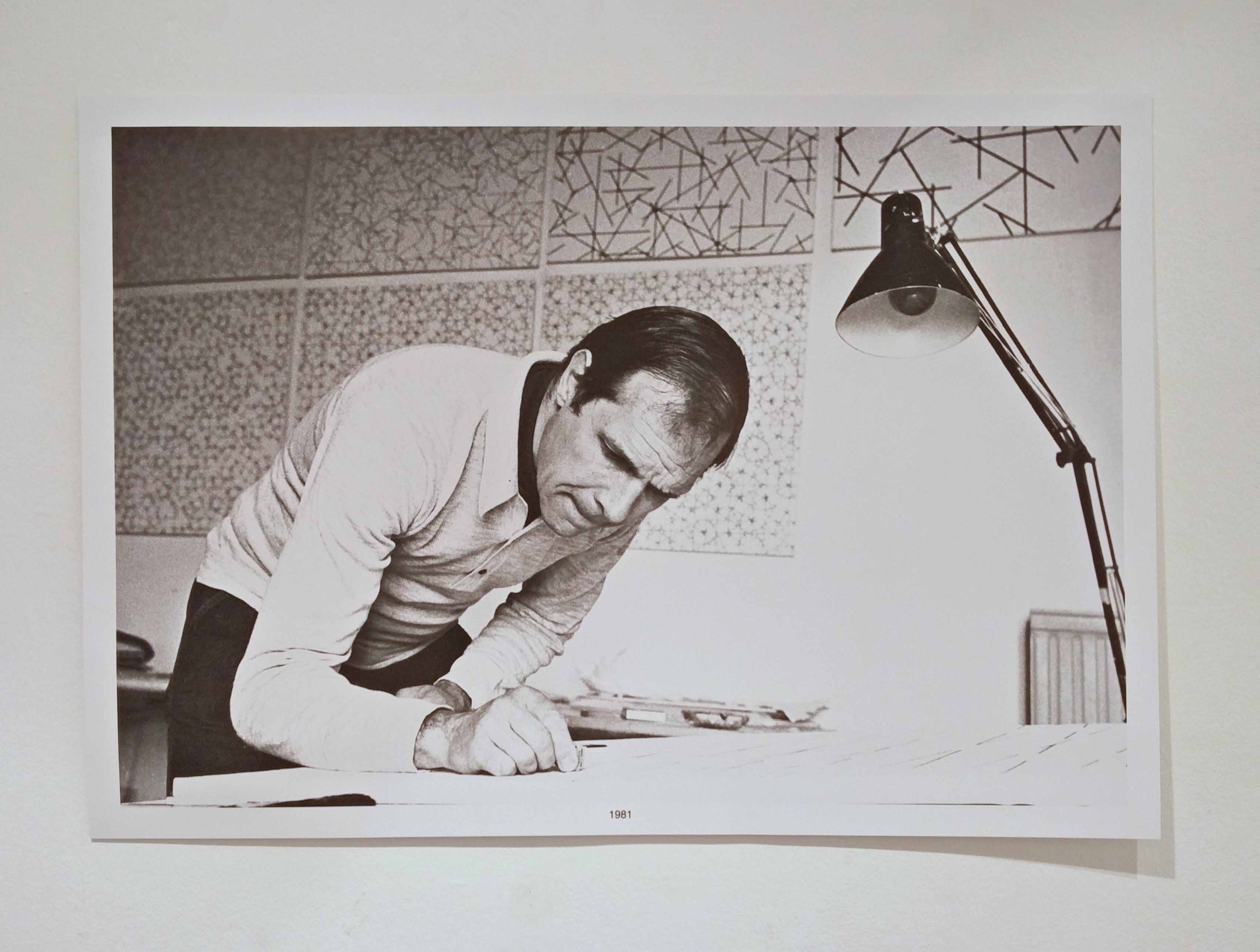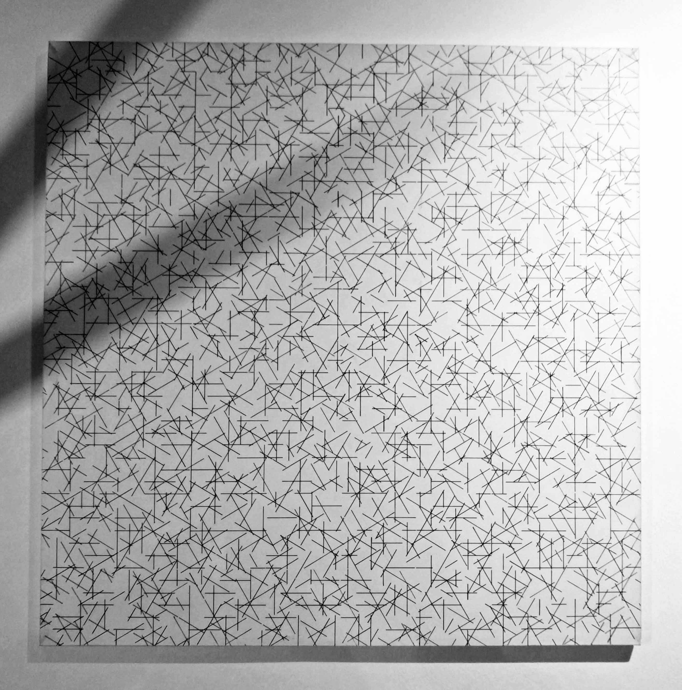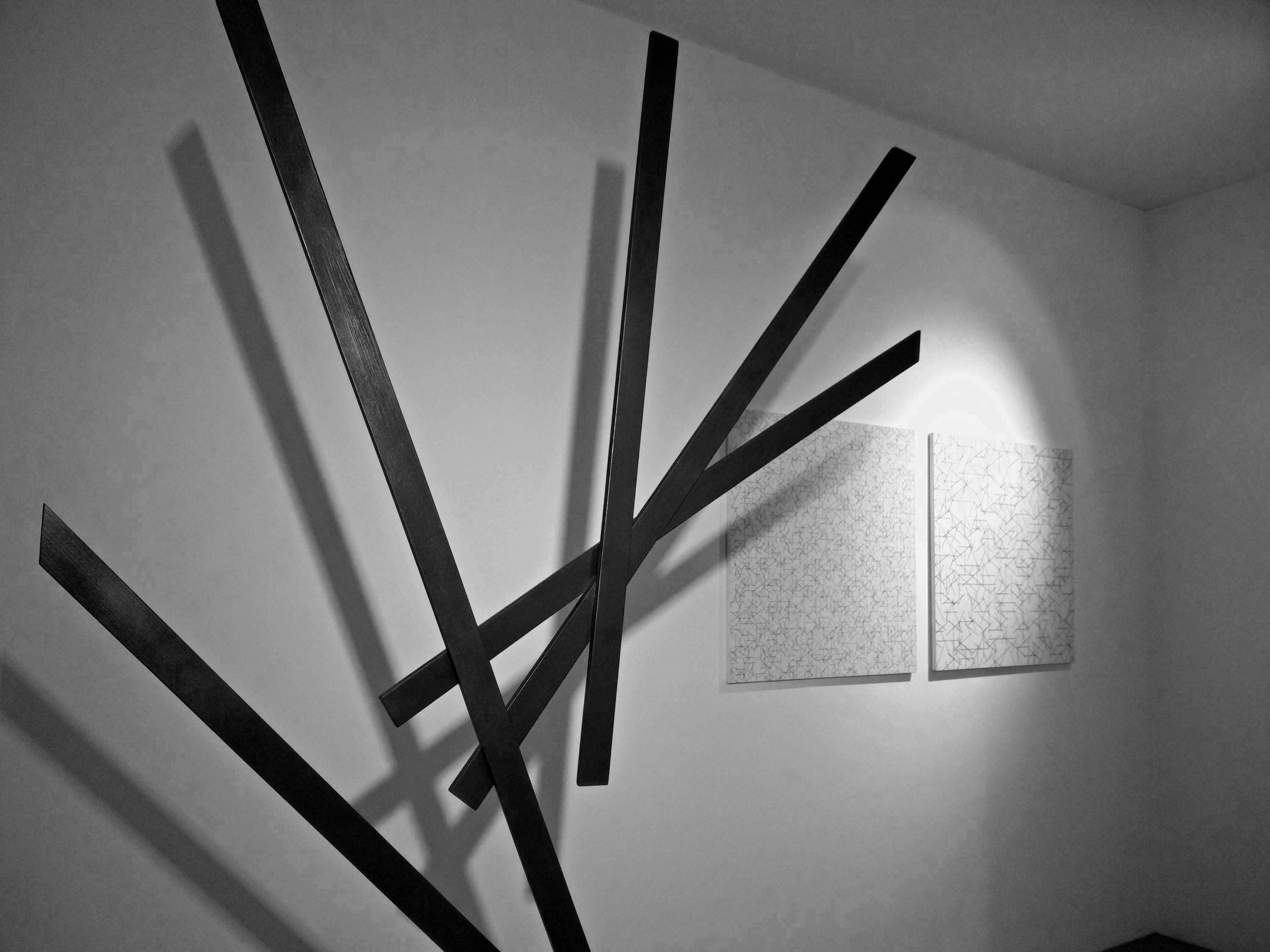 In a second stage he enlarged details of the first structure, so it is easier to identify the combinations of lines. For the exhibition at the Kemi Art Museum (Kemi, Finland) in 1983 the artist went even another step further. He isolated a single structure of crossed lines and increased it to build it as a wooden sculpture on a pedestal. This original figure is still in Finland, but in the exhibition there is a reproduction, installed in a single room with a poster of the original and two of the line images. The light direction casts the sculptures shadow on the wall besides the pictures, so that the three stages of the artist’s lines are visible together.