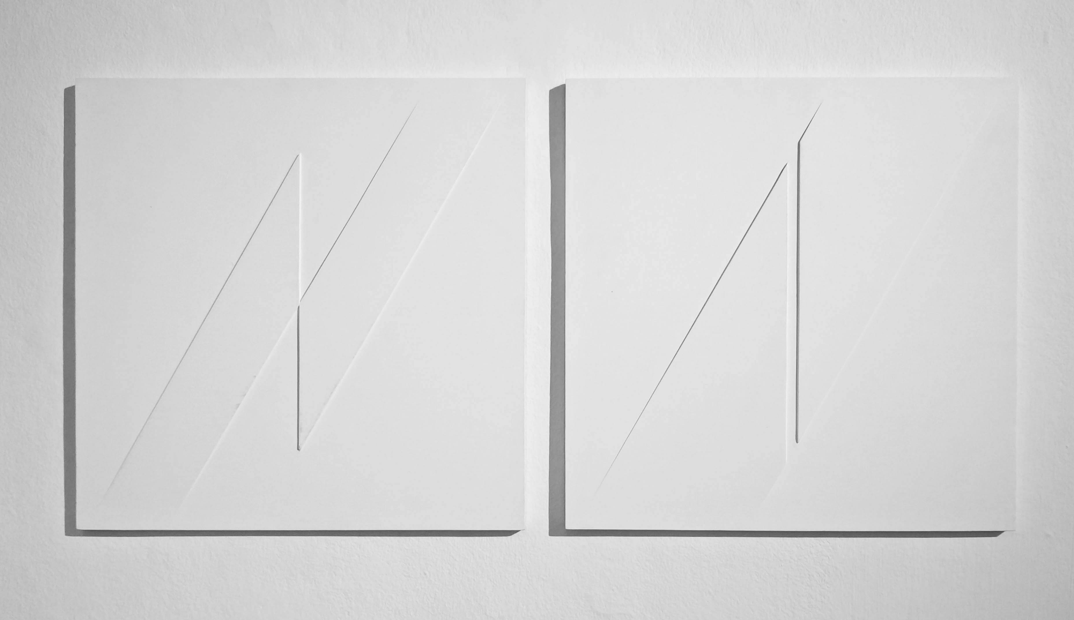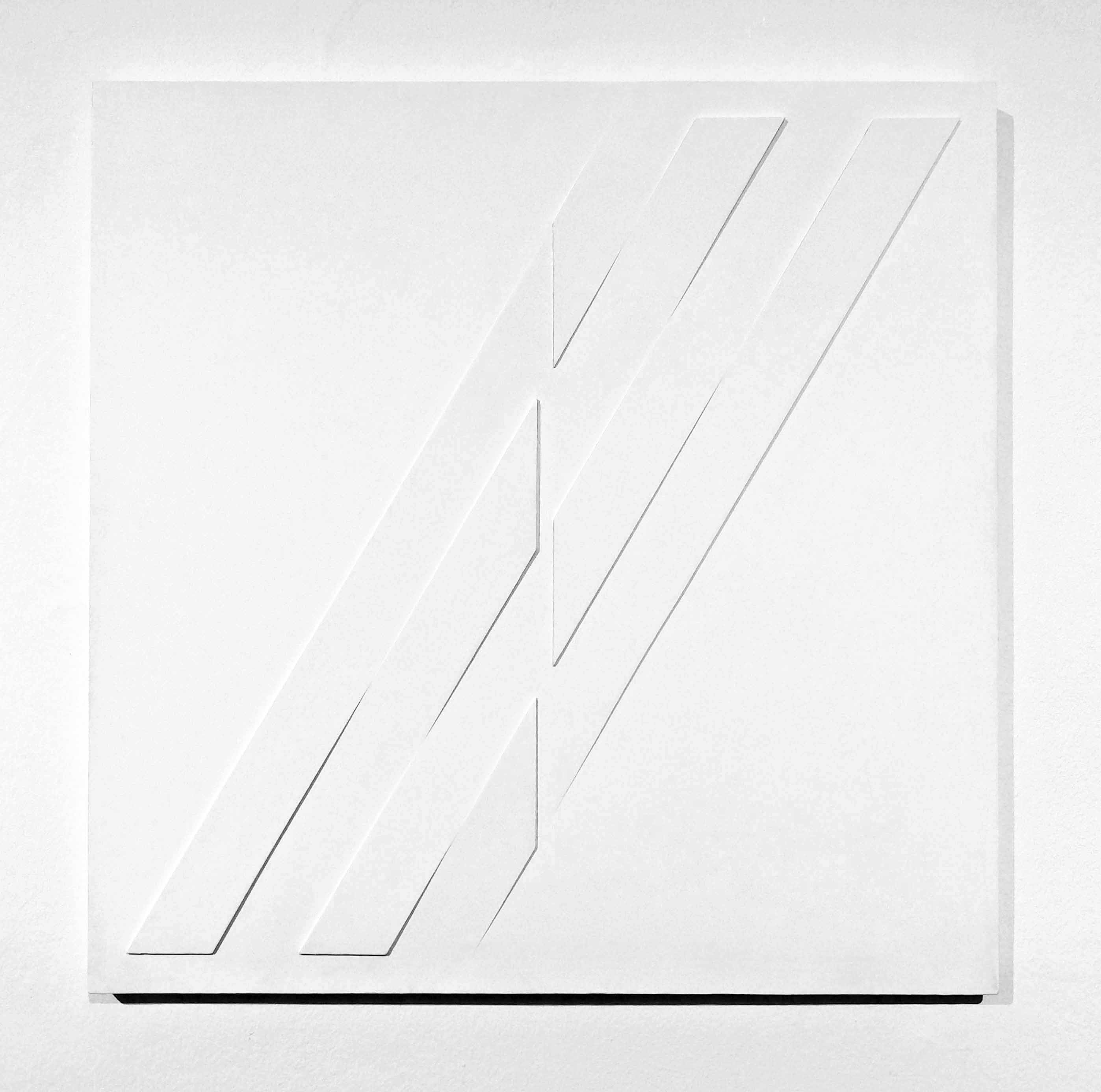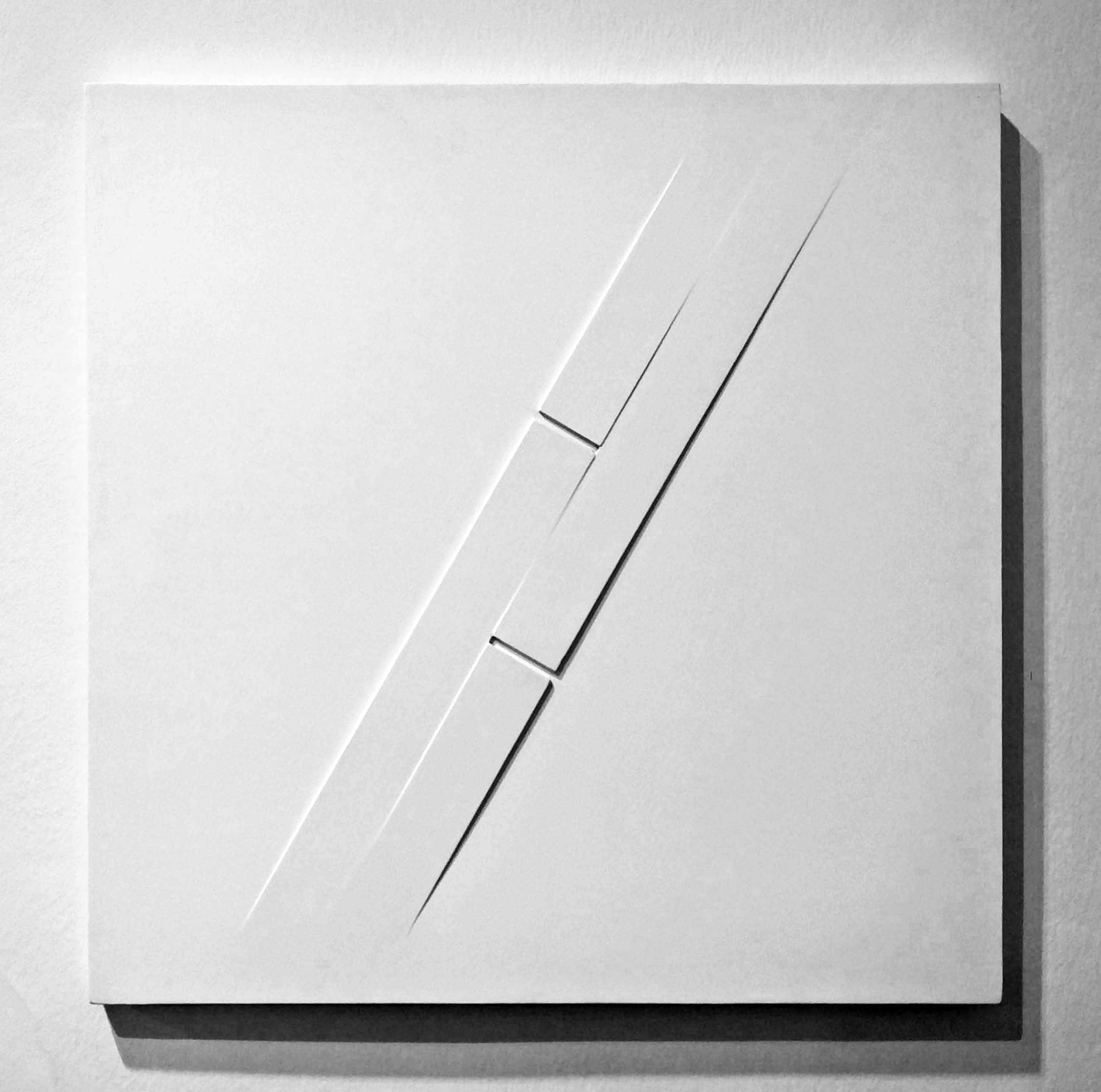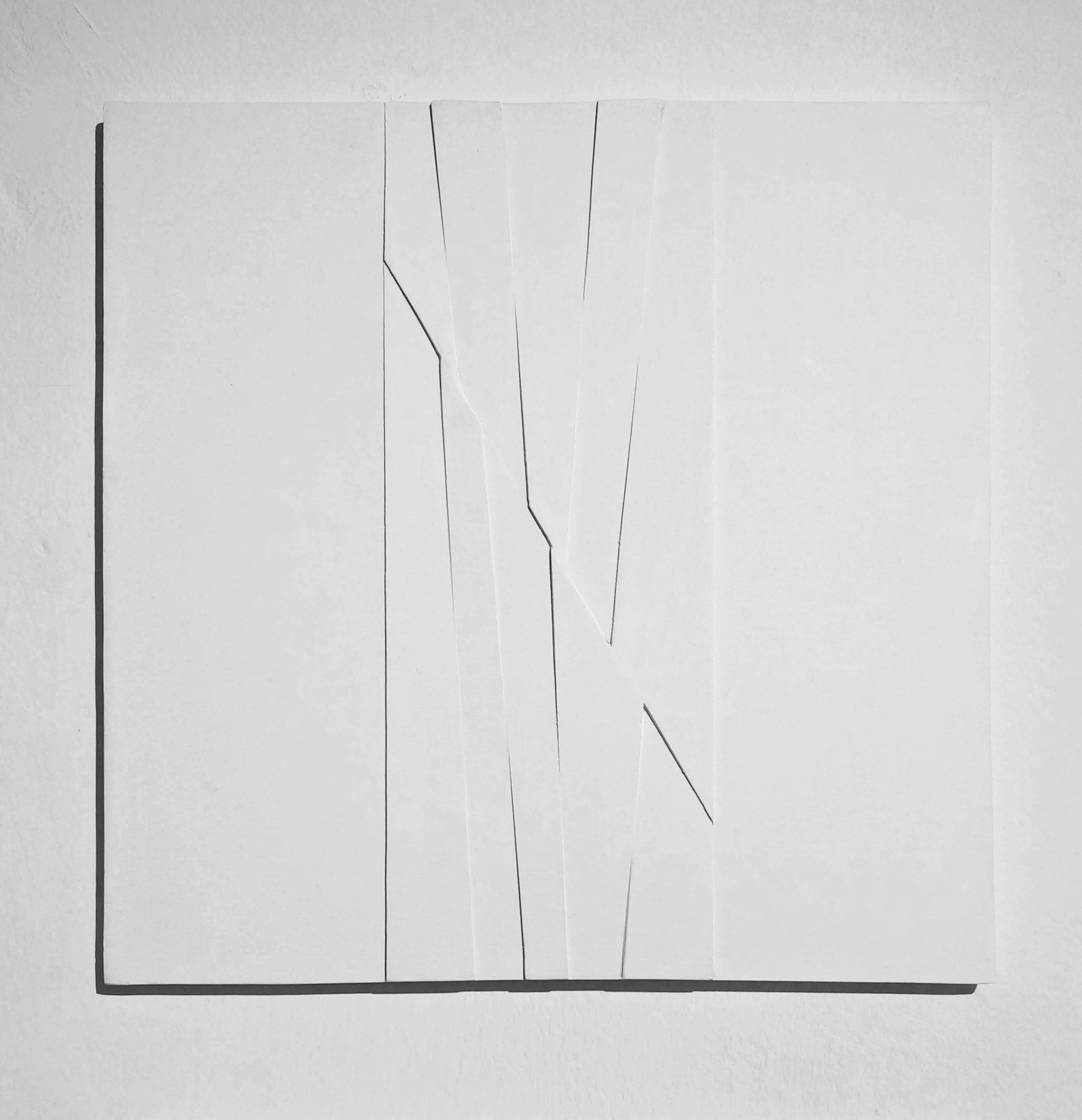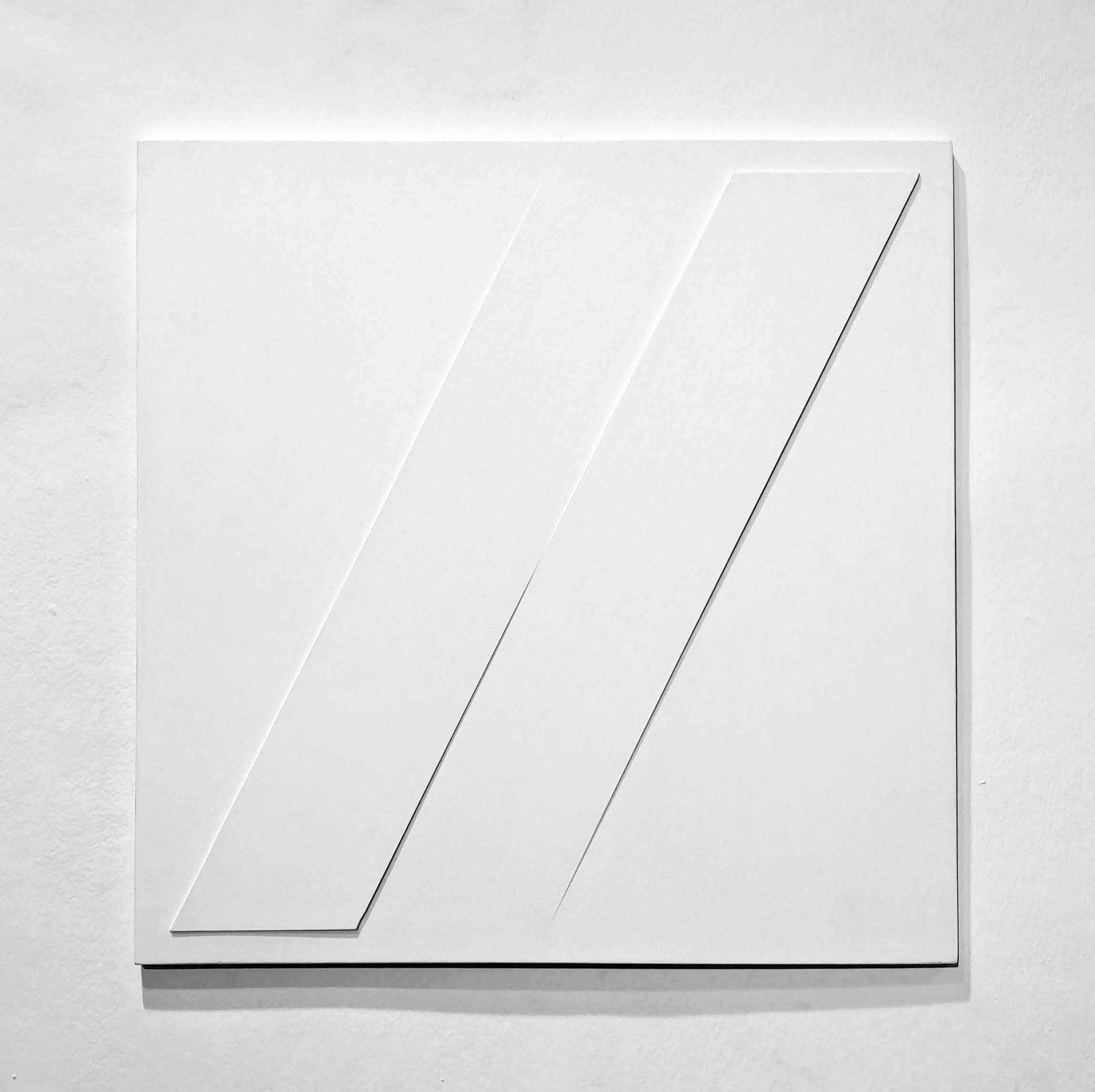 Alberto Zilocchi’s reliefs are monochromes which can be associated to constructivist research to create abstract artworks without being a reflexion of the existing world. Moreover they refer to artistic efforts in the 1950s and later to structure an image by paint application and shaped canvas. These interventions guided to monochrome images where the colour itself is the main actor in cooperation with light incidence and shadows, caused by the relief of the surface. The often used Italian expression for shaped canvas is “estroflessione”. In the context of Alberto Zilocchi’s works the translation as advances or projection in the sense of overhang might be more appropriate, since he worked with wood panels instead of canvas. His from the picture surface outstanding geometric forms are actually the reminiscences of the original plane. To make them visible he carved them precisely out and painted them with white acrylic colour.