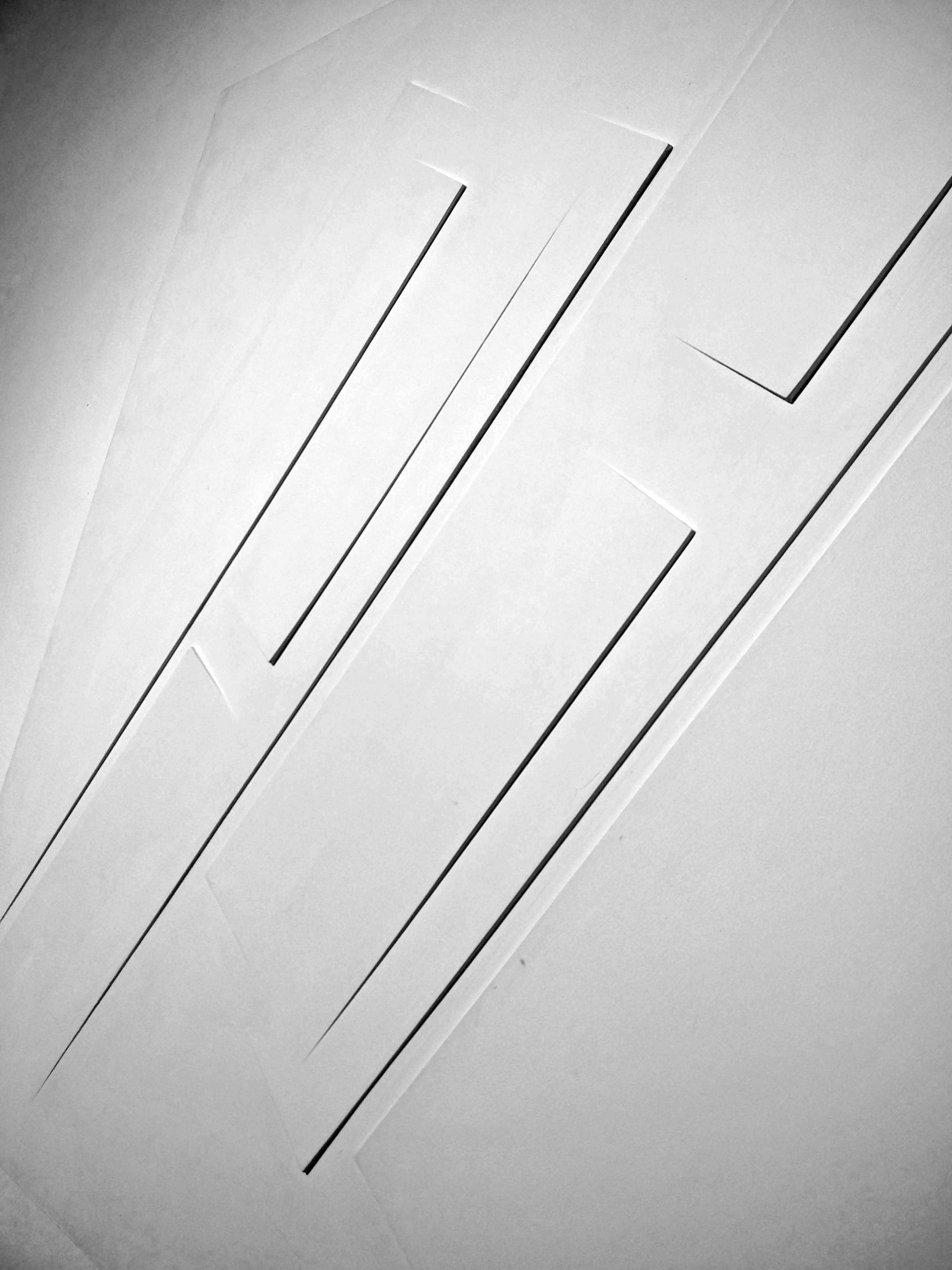 The results are geometric designed panels. Sometimes there are only some diagonal or vertical arranged oblong rectangles. In other examples there are several square shaped overhangs, on first view without any logical order. Nevertheless the attentive observer will find a system in the arrangement.