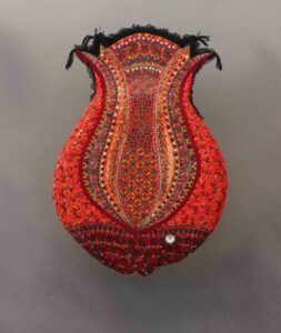 At first glance, one might think that Kina Bogdanova’s mosaic sculpture represents an ornamental flower, perhaps a vase in form of a flower. By its form, it could be a tulip. However, the title suggests it to be a fish, more exactly a “Tulip Fish”. The body of the fish very stylised. It is deprived of his lateral fins, and his tail fin is only hinted by the form and a black fabric. Its three-dimensional body is adorned with a red dominated mosaic formed by beads, mirrored and Tiffany glass. These mosaic elements might be seen as the fish scales. On the darker coloured head is a small round eye: a circle of black pearls surrounds a white field, which accentuates a murrina in yellow and red shades.