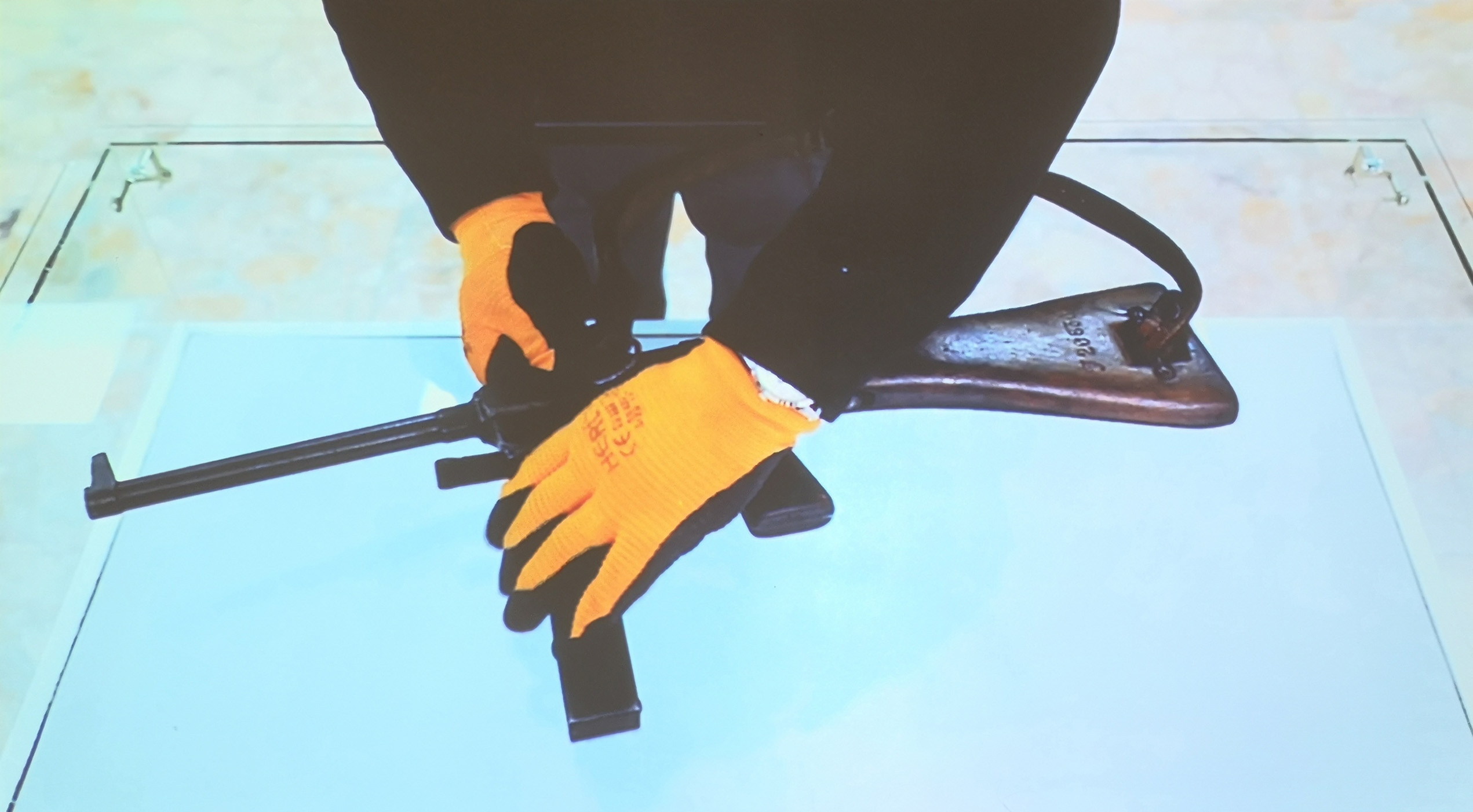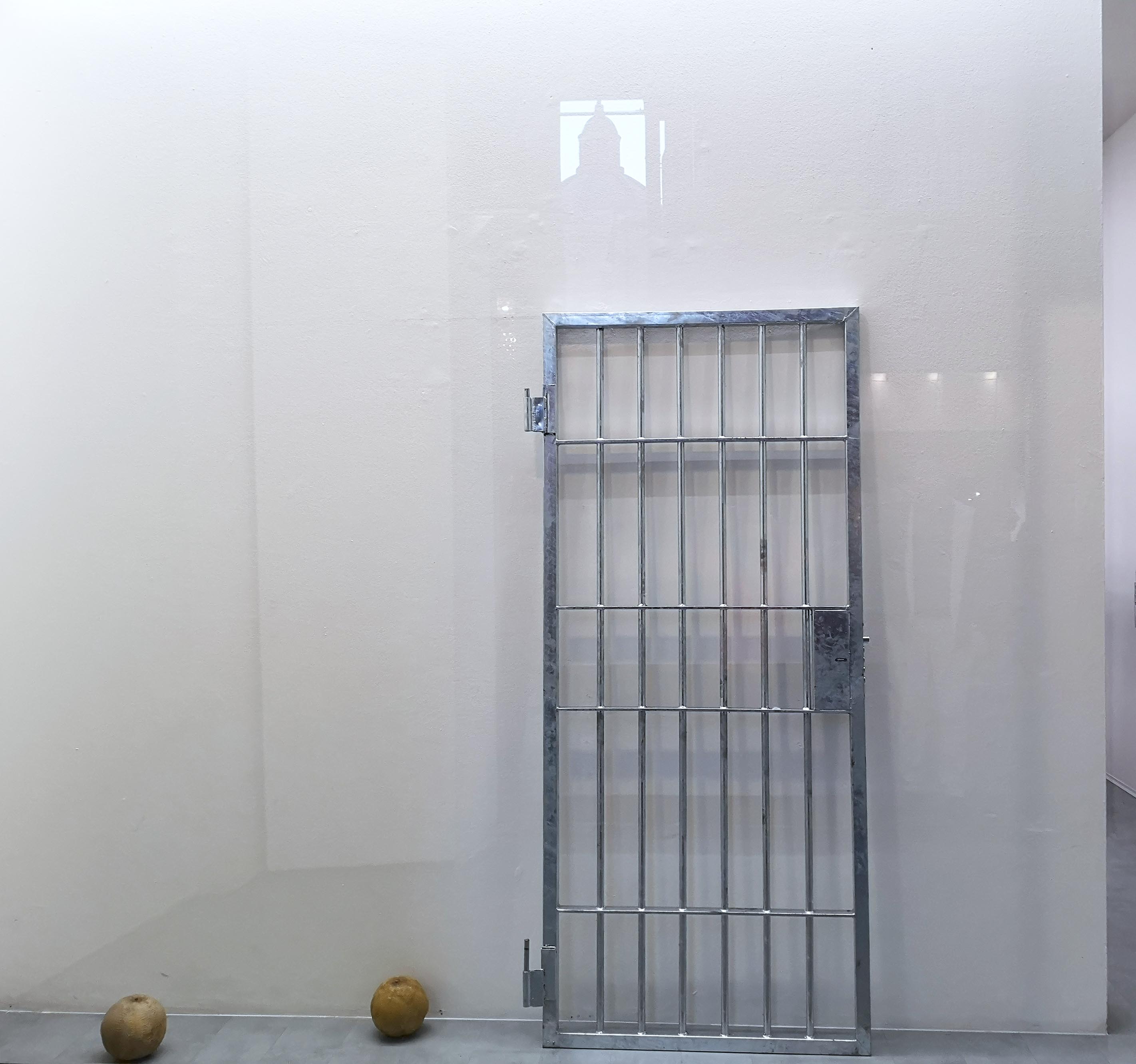 The installation in the gallery’s display window “Untitled (campo di meloni) by Underground Movement, features a prison door and two concrete melons, referring to the current Italian Prime Minister – Giorgia Meloni – and her plan to establish a reception centre for migrants in Albania. In line with this, inside the gallery Pleurad Xhafa reveals a vertical elevation plan of the centre. From the same author is the video “Reassemble” about Walter Audisio’s weapon, with which he killed Benito Mussolini. In a showcase, the missing magazine with four bullets is exhibited. Today, the submachine gun belongs to the Museum of the National Liberation War in Tirana, where it is presented almost like a relic.