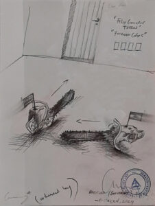 The inconspicuous pencil drawing “(sawchains) witnessed by” by Underground Movement focusses as well on the conflict between Israel and the Palestine people but includes the United States. It is a sketch for a never realised performative installation. The project was planned for a museum space between Florence and Bologna: activated chainsaws with flags of imperial countries, as the United States and Israel are for the artists, should move in front of Félix González-Torres’ colour panels “Forbidden Colors” from 1988. With this artwork, the deceased artist wanted to draw attention to the ban on any arrangement of the colours green, red, black and white in any form in the territories occupied by Israel.