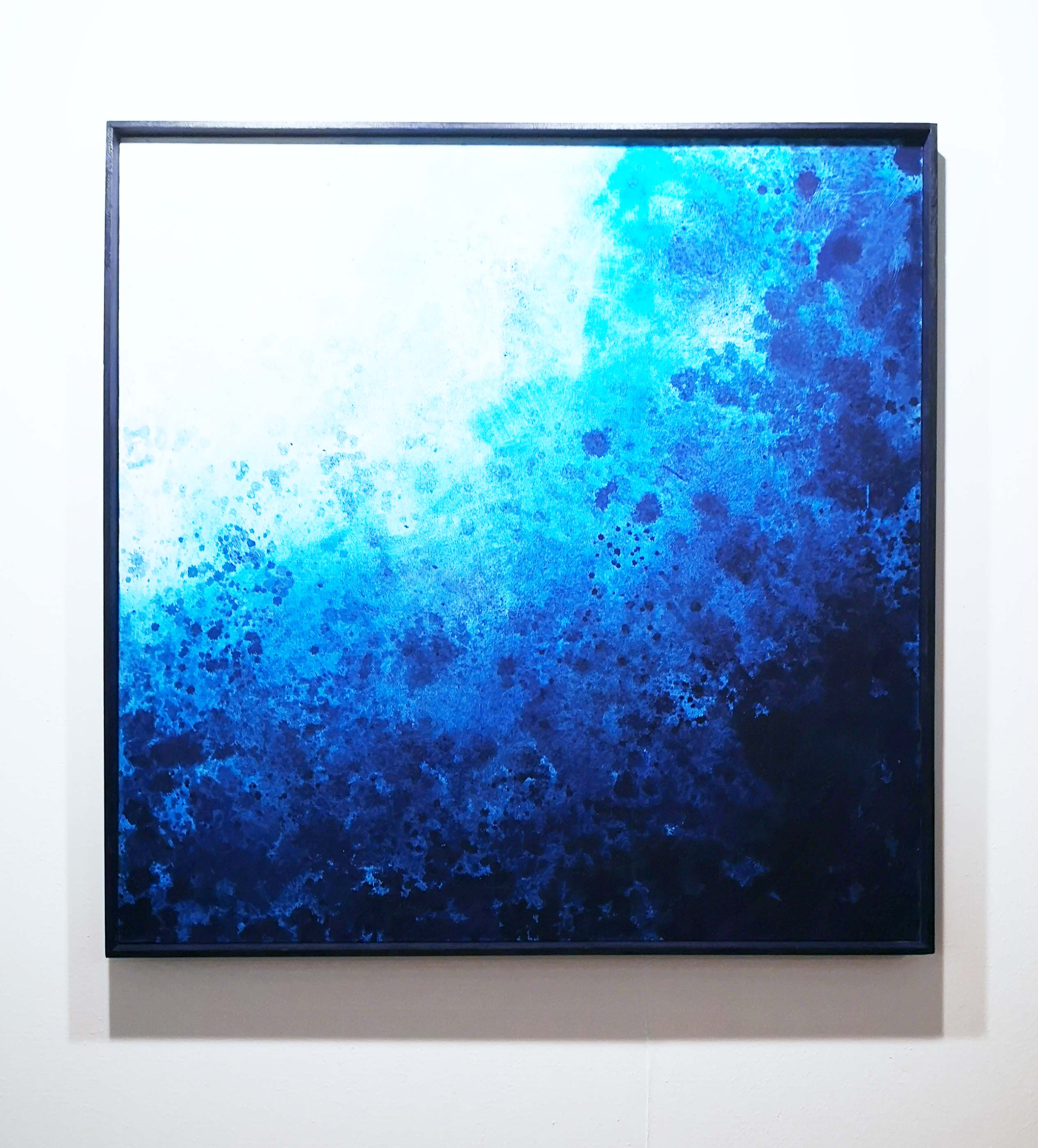 “From the deep” visualises the sensation of a presence, which exceed the human categories, something mystical eternal. Religious people might identify this as God, others as a transcendental power, a potency beyond the human sphere, a supporting force. In associating a cloudlike expression to this feeling, he plays with the in many languages identical word for sky and heaven. In Spanish and Italian, it is “cielo”, similar in French “ciel” and in German “Himmel”. Considering this transcendental power as infinite, the paintings’ frames exemplify the return into reality, to the finite nature of human existence.