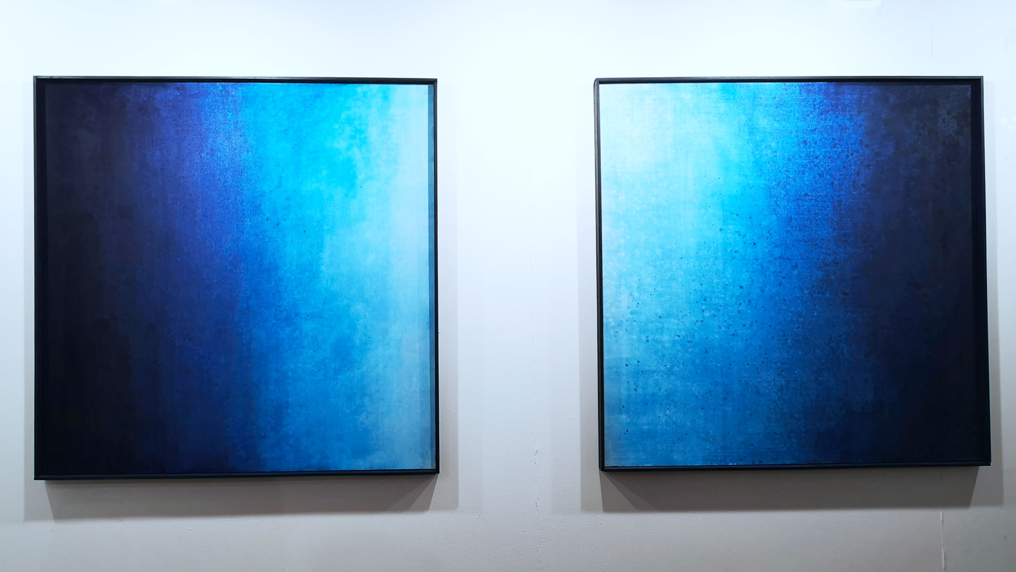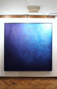 Entering the gallery’s first room, one is welcomed by cloudy panel paintings. Blue shades pass from dark blue – almost black – to light blue – almost white. Sometimes the colour gradient proceeds from left to right or vice versa, diagonally or from the light source outward. They seem to be sights of the sky. The sun shines through the clouds. So close to heaven!
