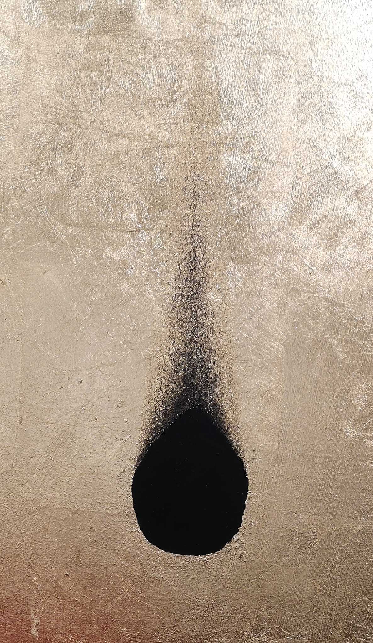 Even though, “Voids” seem to reflect the holy by the real presence of gold, a black Nothing attracts the observer. The pleasant environment of warm gold reflexion is disrupted. Deep black and obscurity spread out of the panel. An emotion of absence and void arises. Nothing appears to make sense. A previously assumed harmony is destroyed. Everything could be questioned. One could disappear into this nothingness, or could pull oneself out of the hole, wander across the golden ground and return with renewed energy to reality after looking into the abyss.