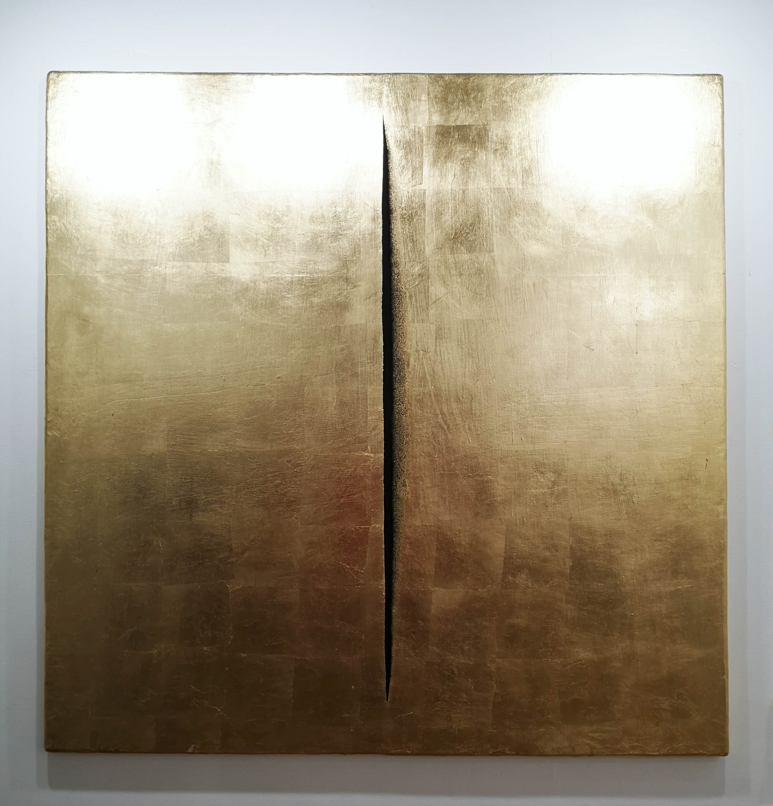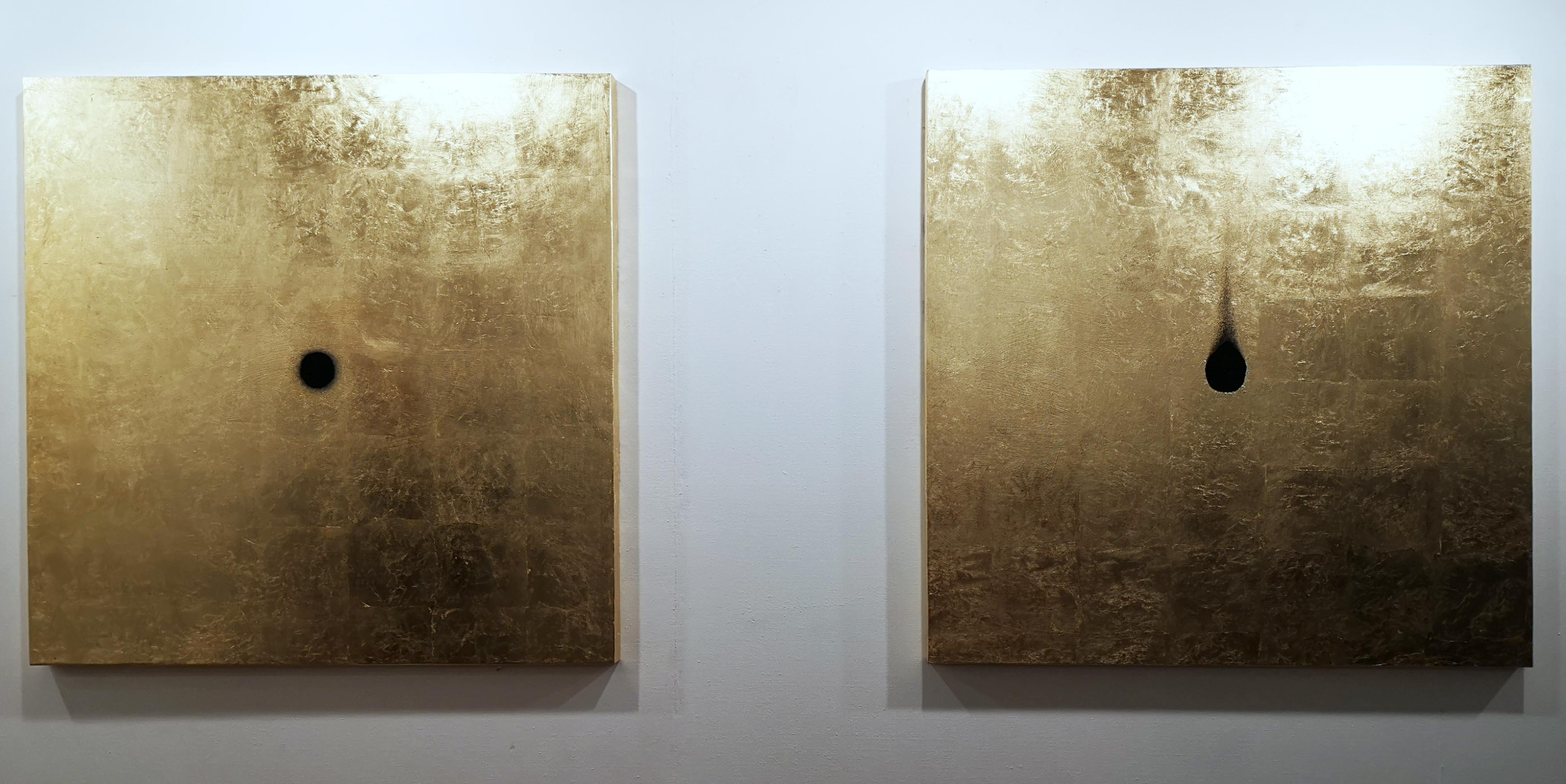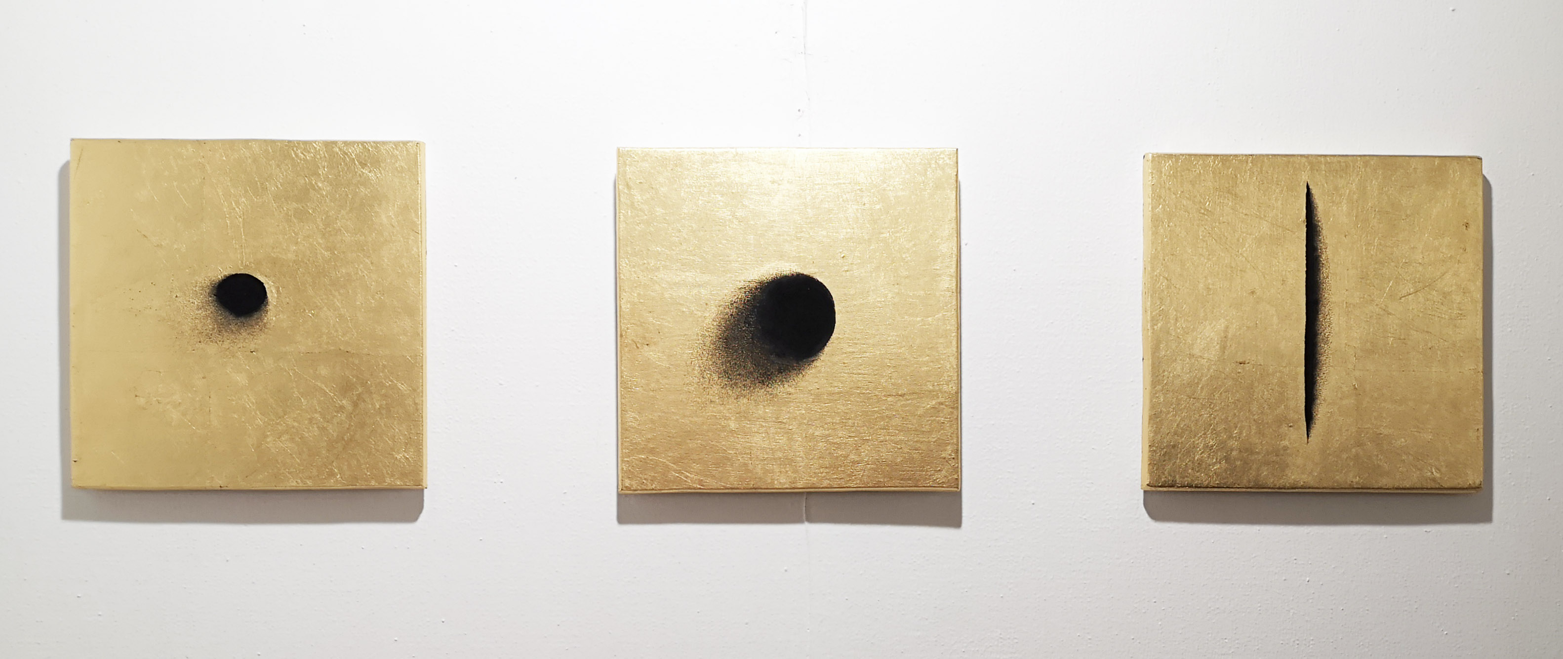 In the second room, it seems to become even more transcendental. From a distance, one recognises golden panels, which remind early Christian paintings, where important religious figures were highlighted by a background of gold leaf, the gold ground. Though, there are no saints. On the contrary, it looks like someone has cut the canvas like Lucio Fontane. Others have black holes in the gold ground as if someone has burned or shot it. A glimpse into the Nothing!