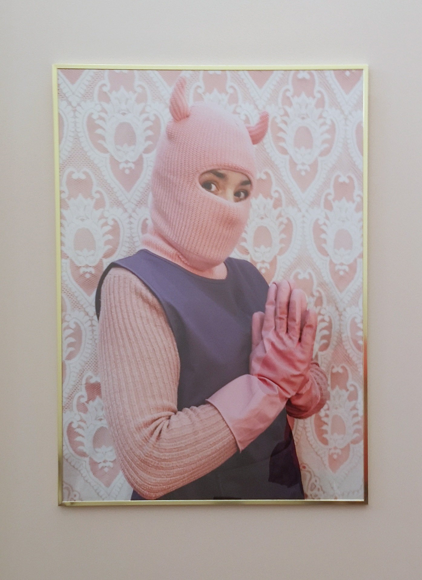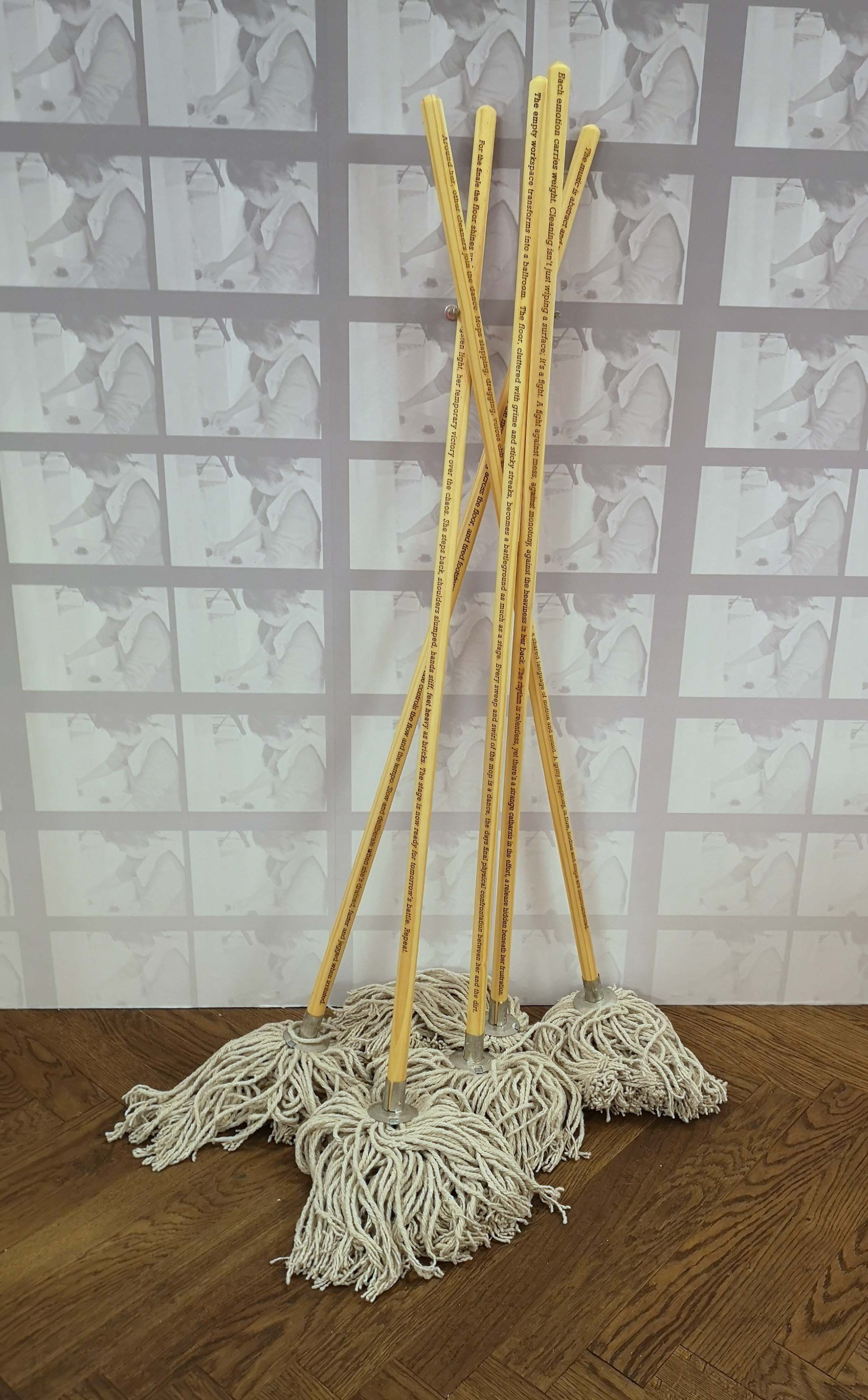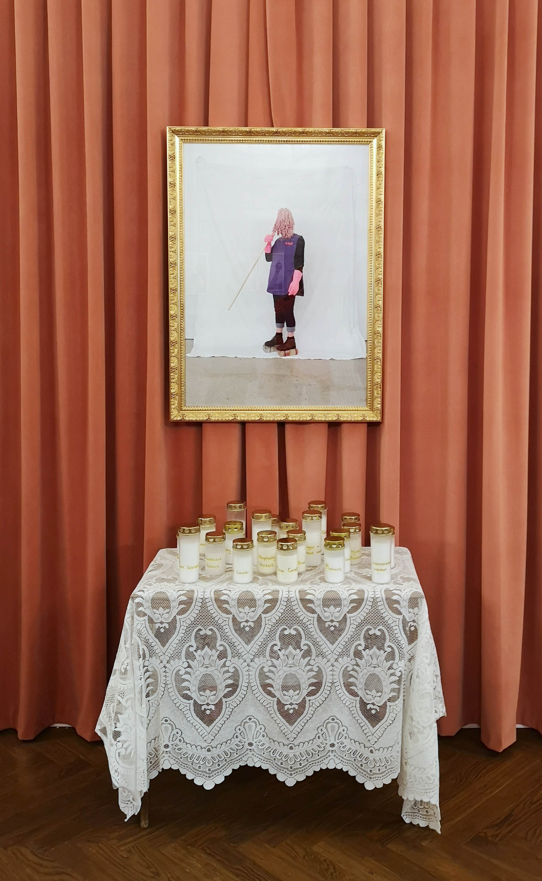 Kelly O’Brien also has an approach to work, but the focus is on domestic work and the women, who are doing it in other people’s homes. Central is a kind of altar, where inscribed grave lights indicate the dedication to care workers. Around, there are photographs of charwomen, partly in ironic postures. Written on mob sticks, there are philosophic reflections about cleaning. A little bit concealed, there is a board with fragmented biographies of care workers – a hint how hidden they are in general awareness? With the exhibition “No Rest for the Wicked” the artist points to class and gender disparities and spotlights the weakest members of societies.