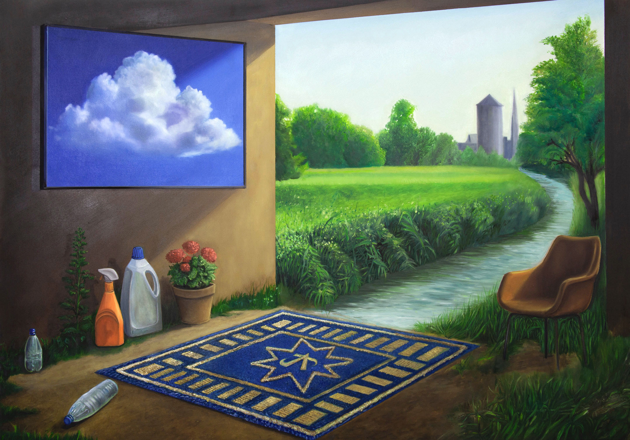 However, the passage between inside and outside is blurred. Herbage enters the room. Thus, the armchair at the right edge of the chamber stands almost in the green. The pale blue sky above the countryside scenery is reflected by a cloud picture, which recalls René Magritte’s paintings. Also the rest of the furnishing is remarkable. Besides a flowering plant pot stand two plastic containers, seemingly cleaning products. Two water plastic bottles are on the floor. Though, the most striking object is a central positioned blue golden carpet. By its colours, the star in the middle with an ornament, which could be a calligraphed “A” it reminds an oriental rug.