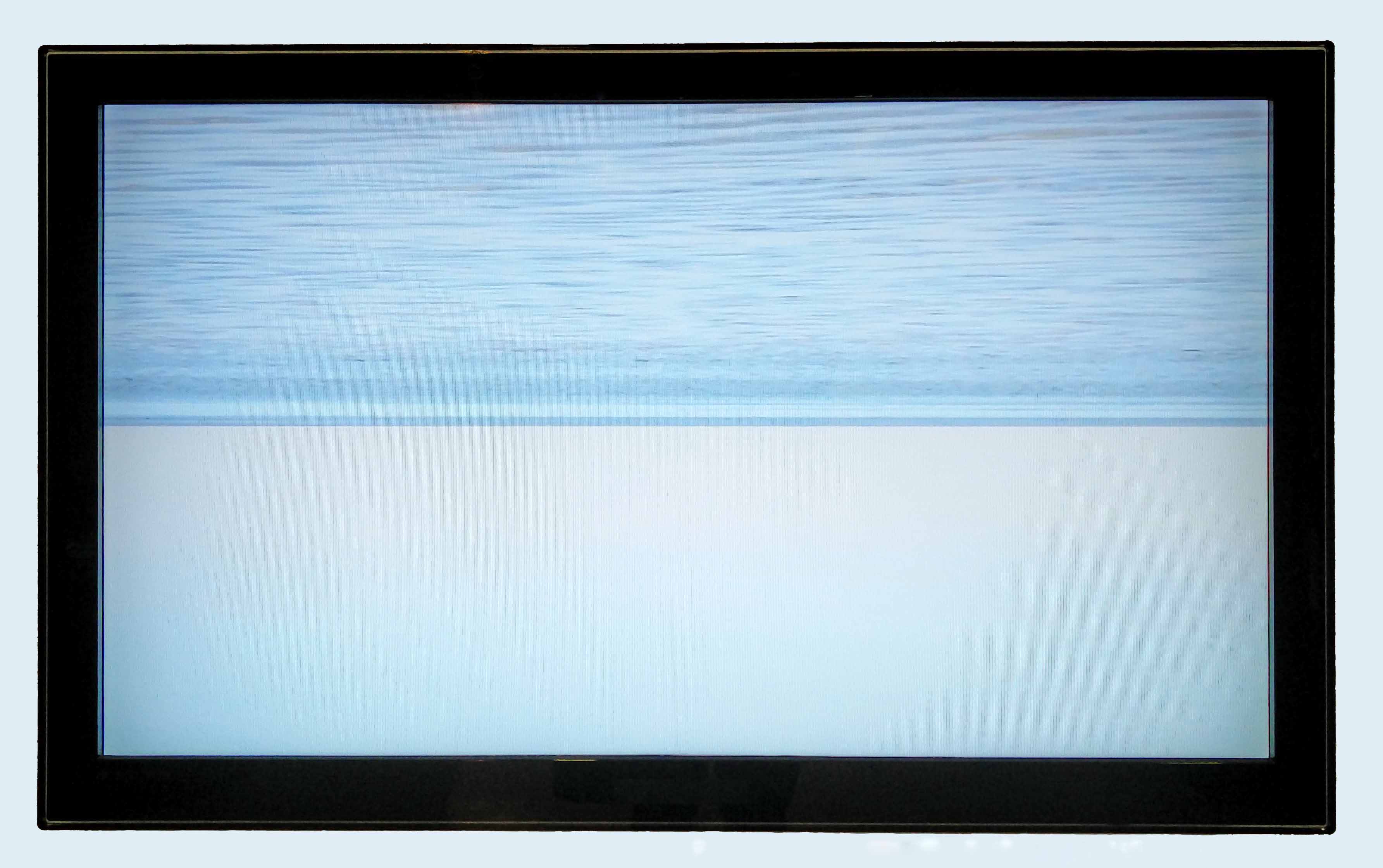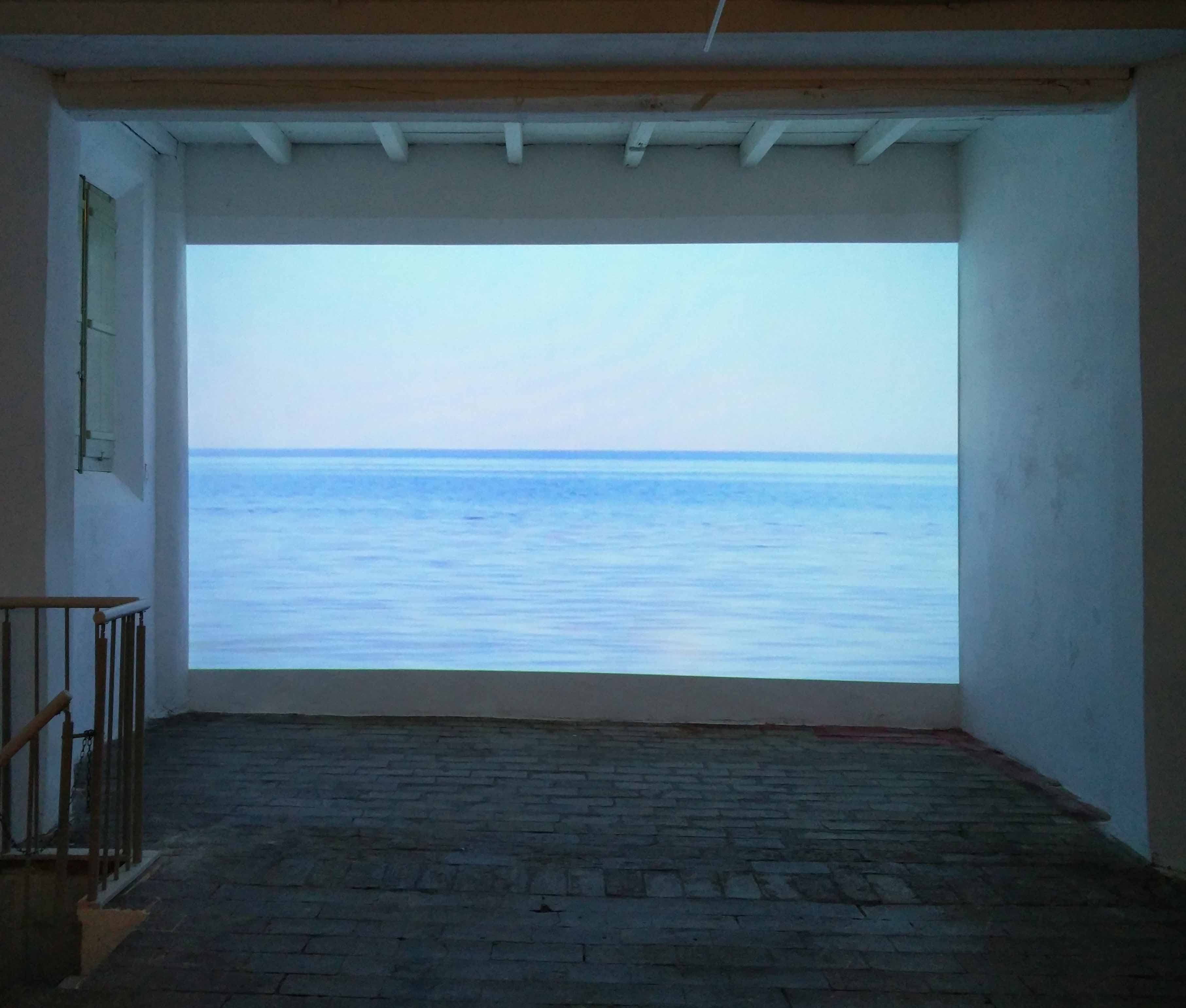 After this first impression the visitor could see a monitor at the face wall on the right hand. Coming closer, it becomes apparent that there is not only a photo of the sea on view, but a video. Waves are approaching softly … What are they approaching? The central line is not the border, where water meets beach. It is the horizon line, where water meets sky. Only that the sky is in the lower part of the image and the sea in the upper part. The image is turned upside down. Nevertheless, the contemplation is not necessarily disturbing. It might as well be perceived as calming because of its meditative nature.