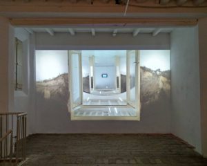 Suddenly this calm scene starts to move. The image gets smaller and smaller. First there appears the black screen frame, then the white wall besides. Afterwards the video gets even more confusing. A room with shutters becomes visible; the floor is made by wooden beams. An arch, side walls with landscape paintings, another room, a glass door, and new side walls with similar landscape paintings and so on are flying into the view, meanwhile the monitor gets smaller and smaller. It seems like something is pulling the screen to a central point behind the projection wall. It’s difficult to define the space that passes by, until the movement stops unexpectedly.