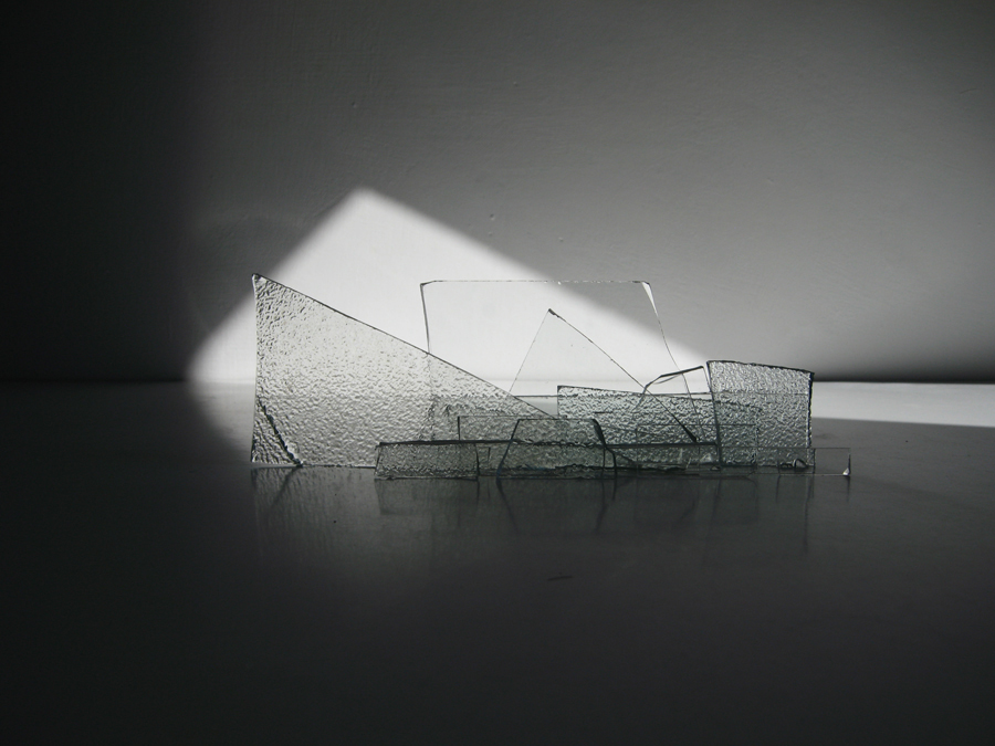 In contrast to that are Angiola Gatti’s black and white photos of small glass plates with their sharp edges. Since the process is even here part of the creation, the first step is a sculptural. Through the application of light and the following taken photo, the three-dimensional ephemeral sculpture is transformed into a two-dimensional oeuvre, which shows lines and geometric forms.