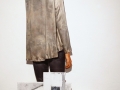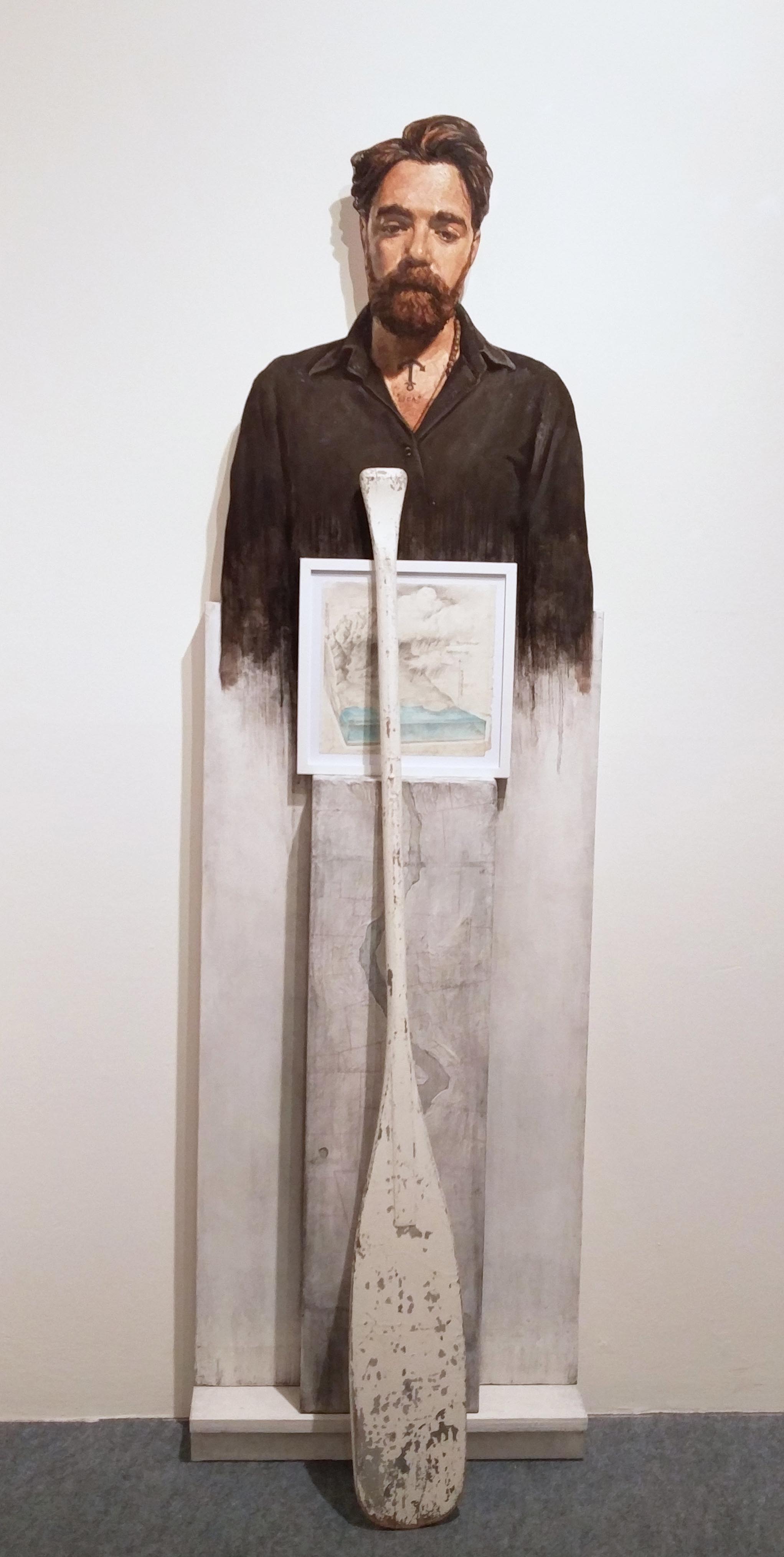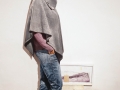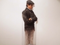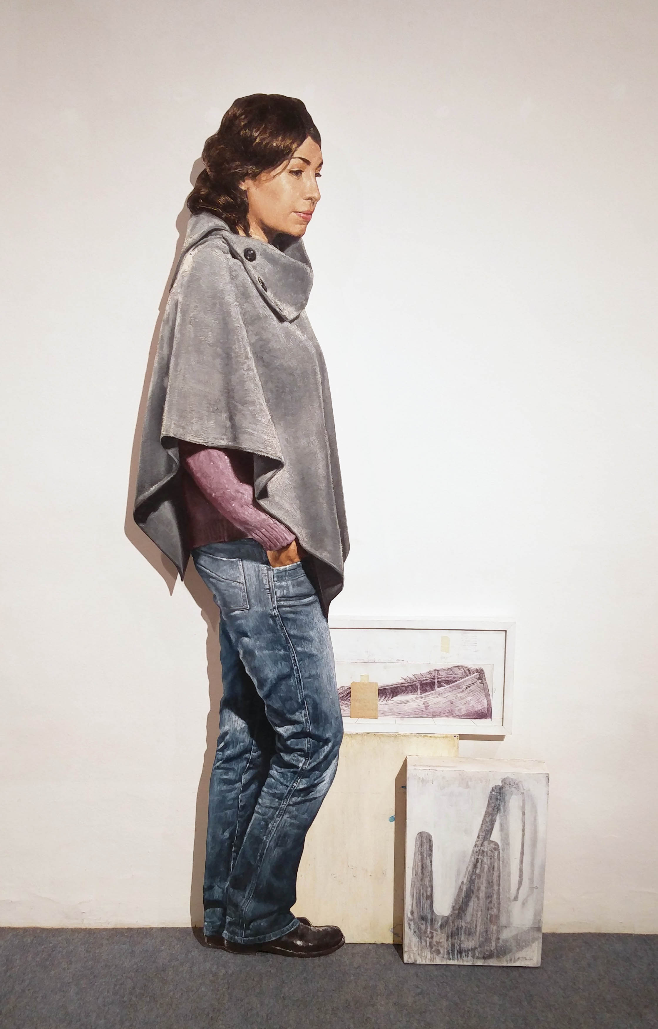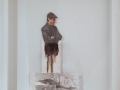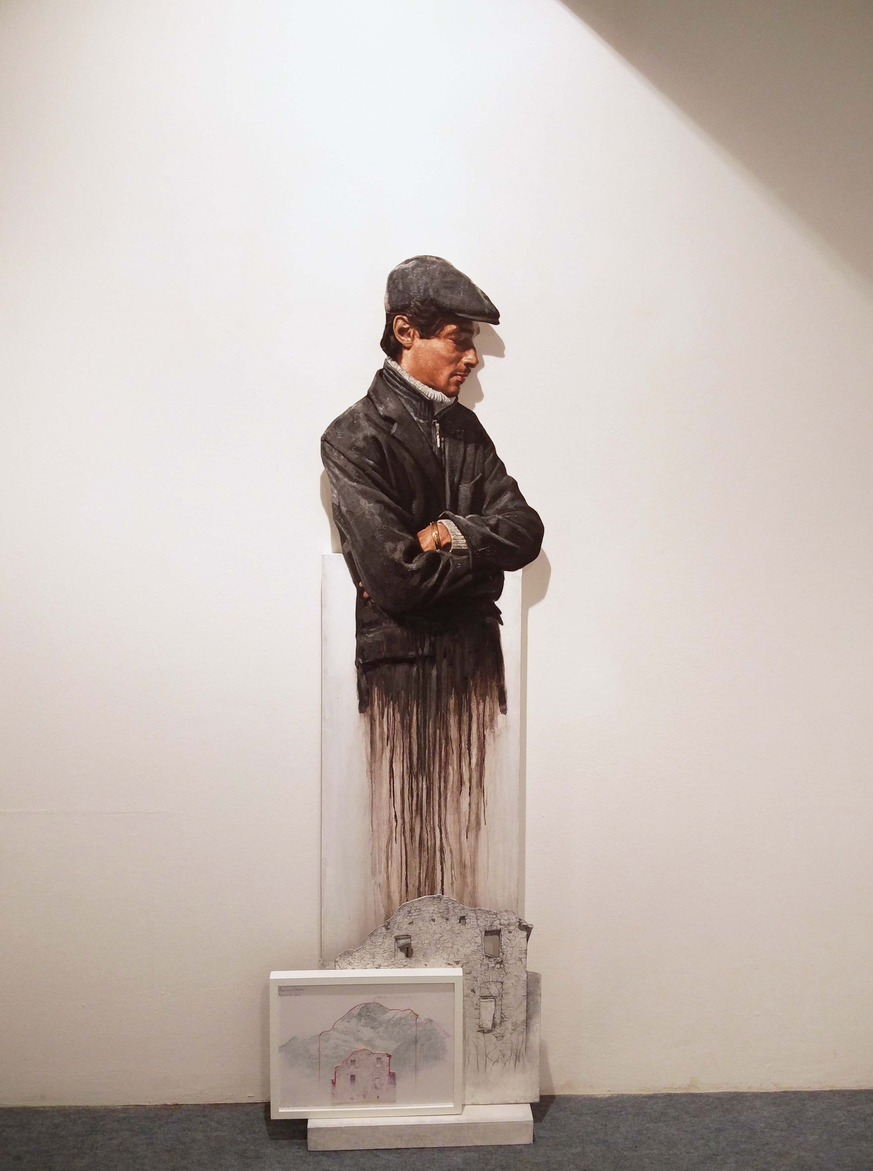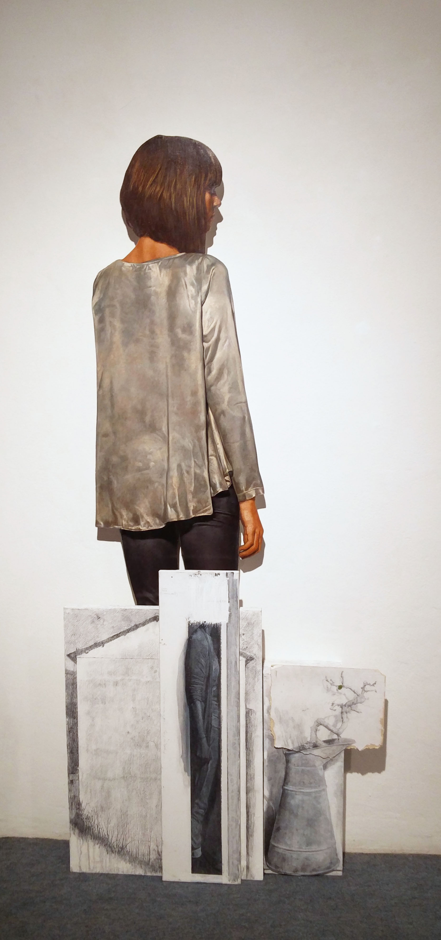 Like the title of the exhibition, “Unstable Places” at the Spazio Testoni underlines the represented people by Matteo Tenardi often lack the ground contact. The lower body dissolves or is disguised. Others vanish, as they seem to be part of the contemplating spectators. Moreover, even a definition of category of artworks remains nebulous: they are photorealistic paintings, sculptures, collages and installations at the same time. In addition, there are small framed collages besides the quasi life-sized oeuvres. At first glance, they could be perceived as sketches for the bigger works; at second view, it becomes evident, that they are independent creations only with the same model.