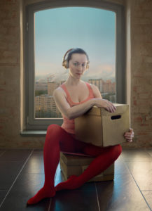 “Receiving Orders. Salome and St John” by Katerina Belkina shows a young woman, sitting in a straight posture with slight straddled and bent legs on a cardboard box. She is dressed in red tights, a pink long tank top and wears headphones. With both hands, supported by her left leg, she holds another cardboard box with reddish traces at the visible lower front angle. Although her torso and head are slightly directed to her left, her view focusses to the right. The room seems to have slate floor and the walls are sandy painted, but leaving the bricks shine through. In the background, there is a window opening to a cityscape with high-risen buildings and industry. Even though, it is clearly a contemporary photo, the composition and the colours reminds to renaissance paintings.