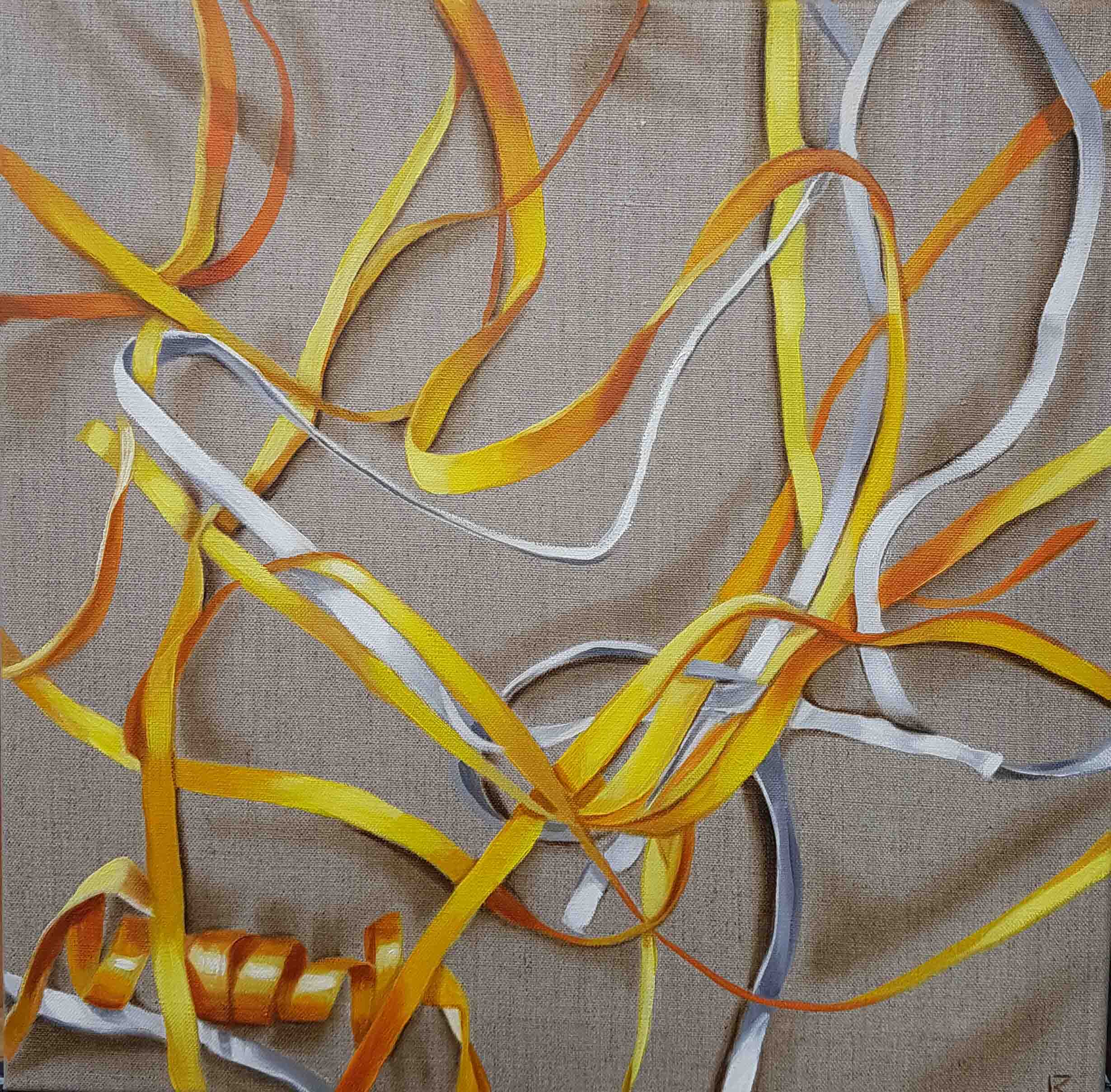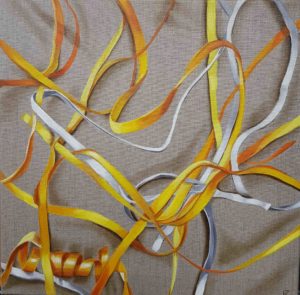 Katia Miranda points with her work to the contradictions of our lifestyle, which produces beautiful things, but also a lot of waste that pollutes our environment. For our artwork of the month September, “Permanent Maze”, she focussed on plastic packing belts, handsomely arranged in her painting.