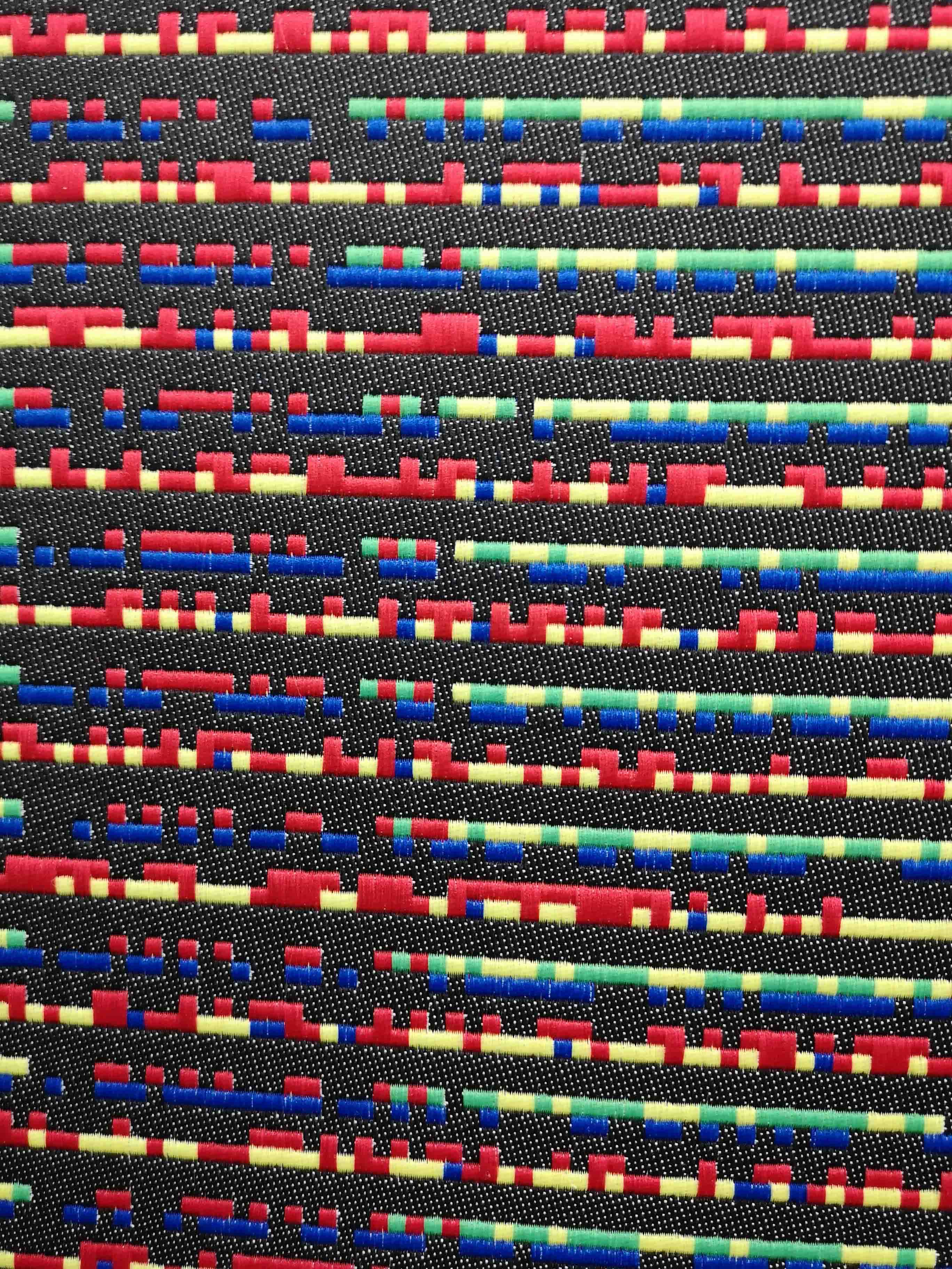 A voyage from the beginnings of programmed weaving to high technology fabric production including the artist’s genetic code.