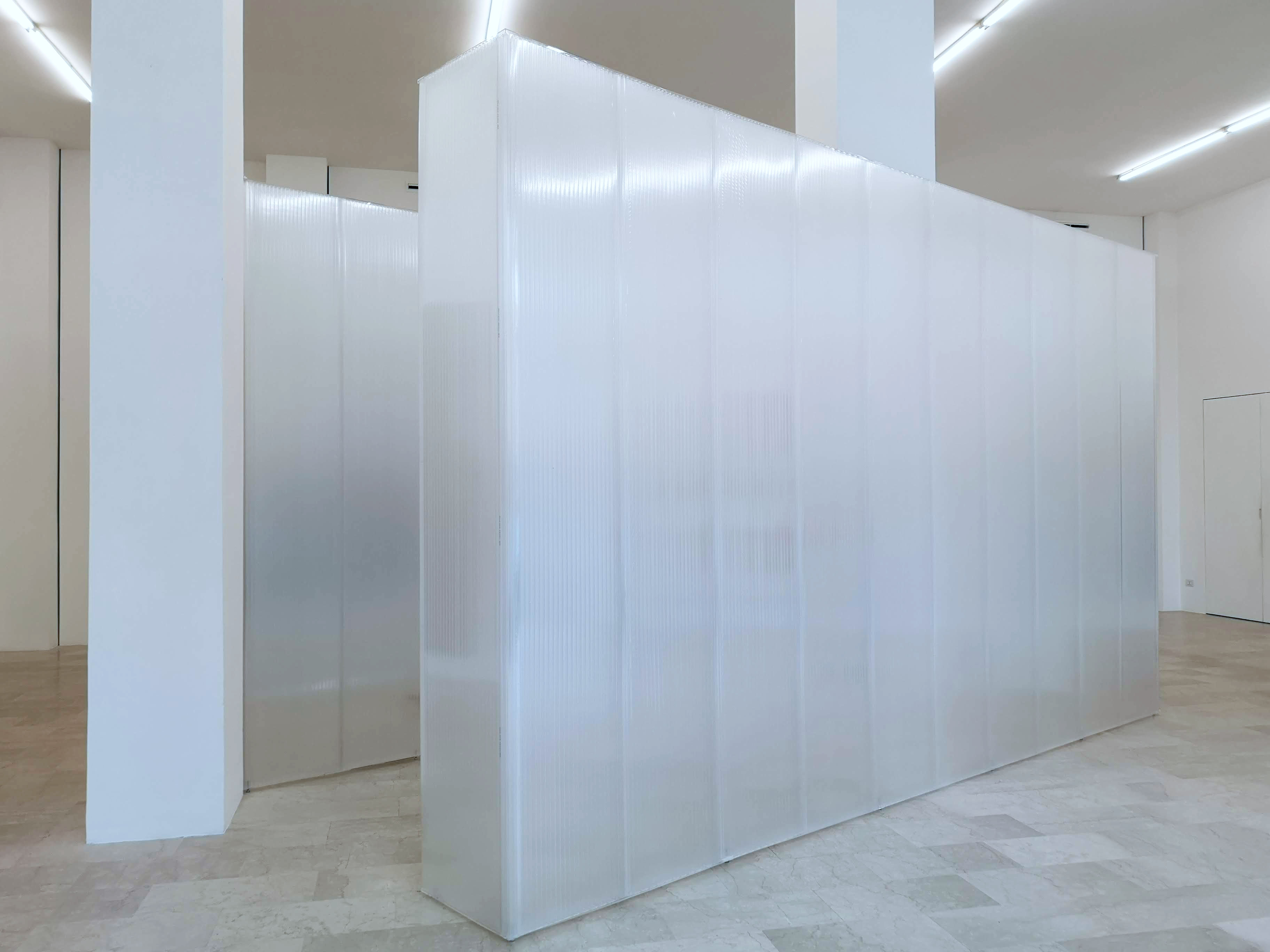 Two similar white two-dimensional artworks in communication with their exhibition space.