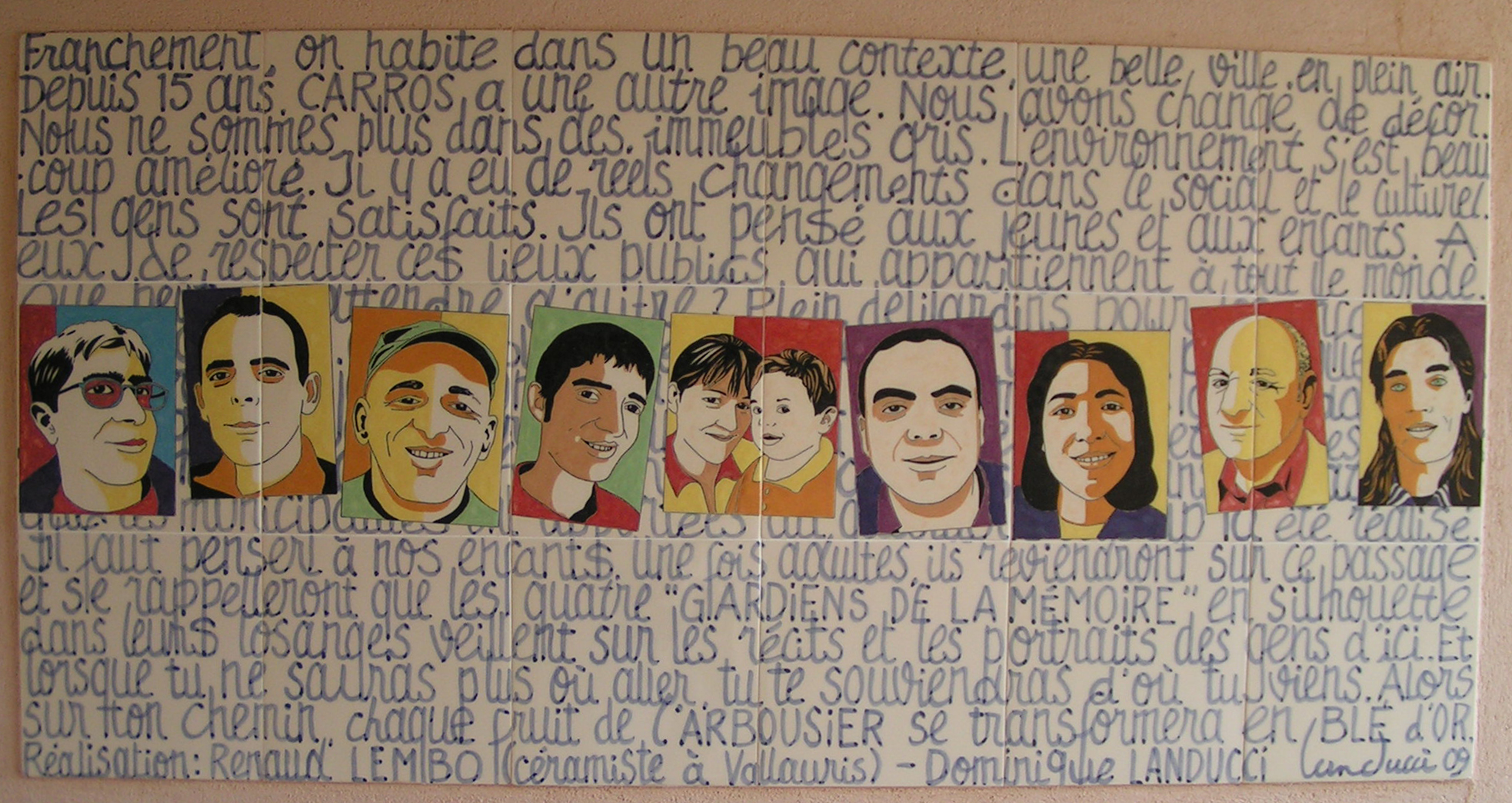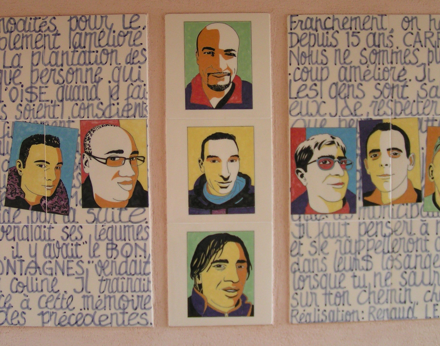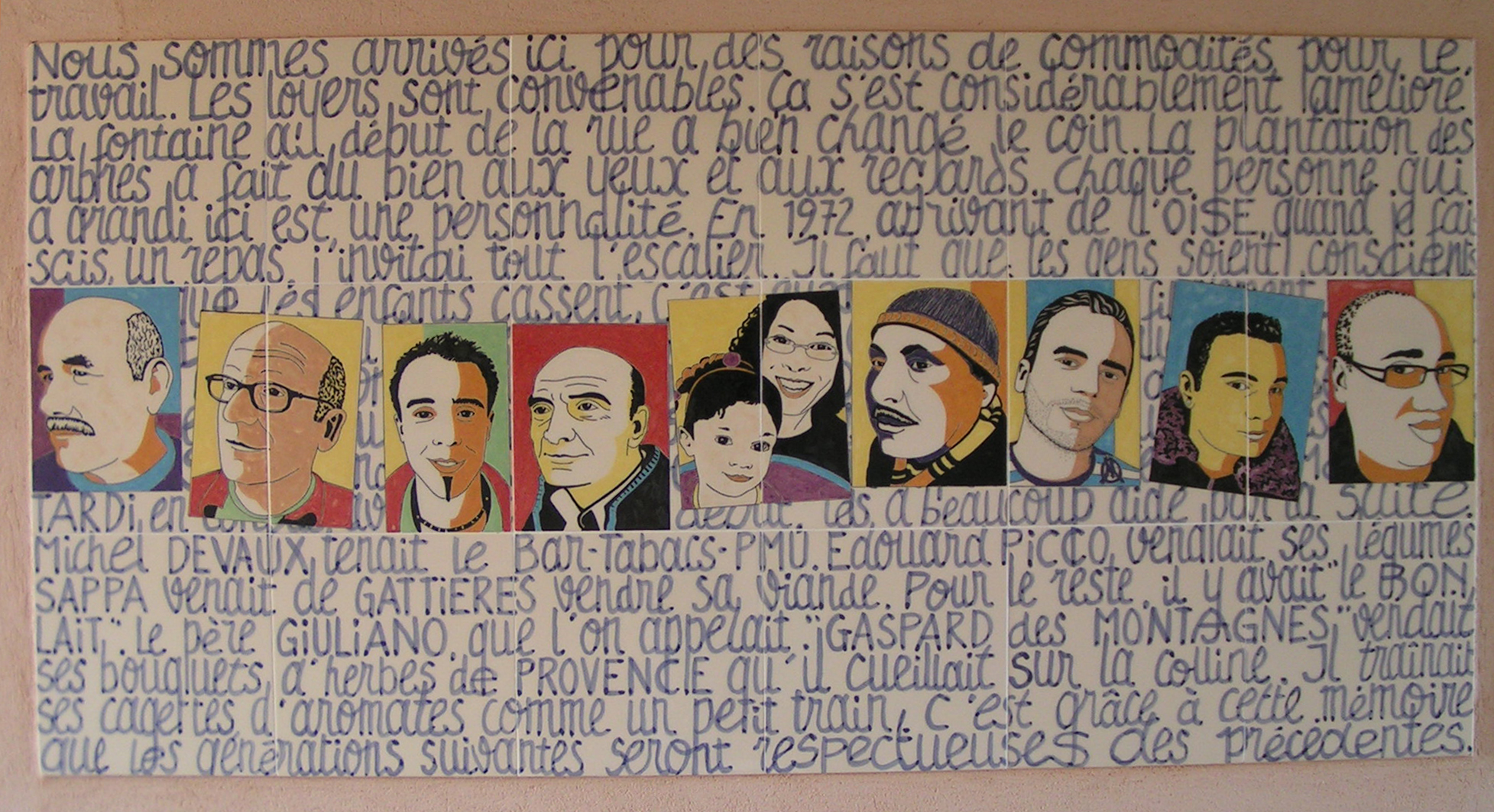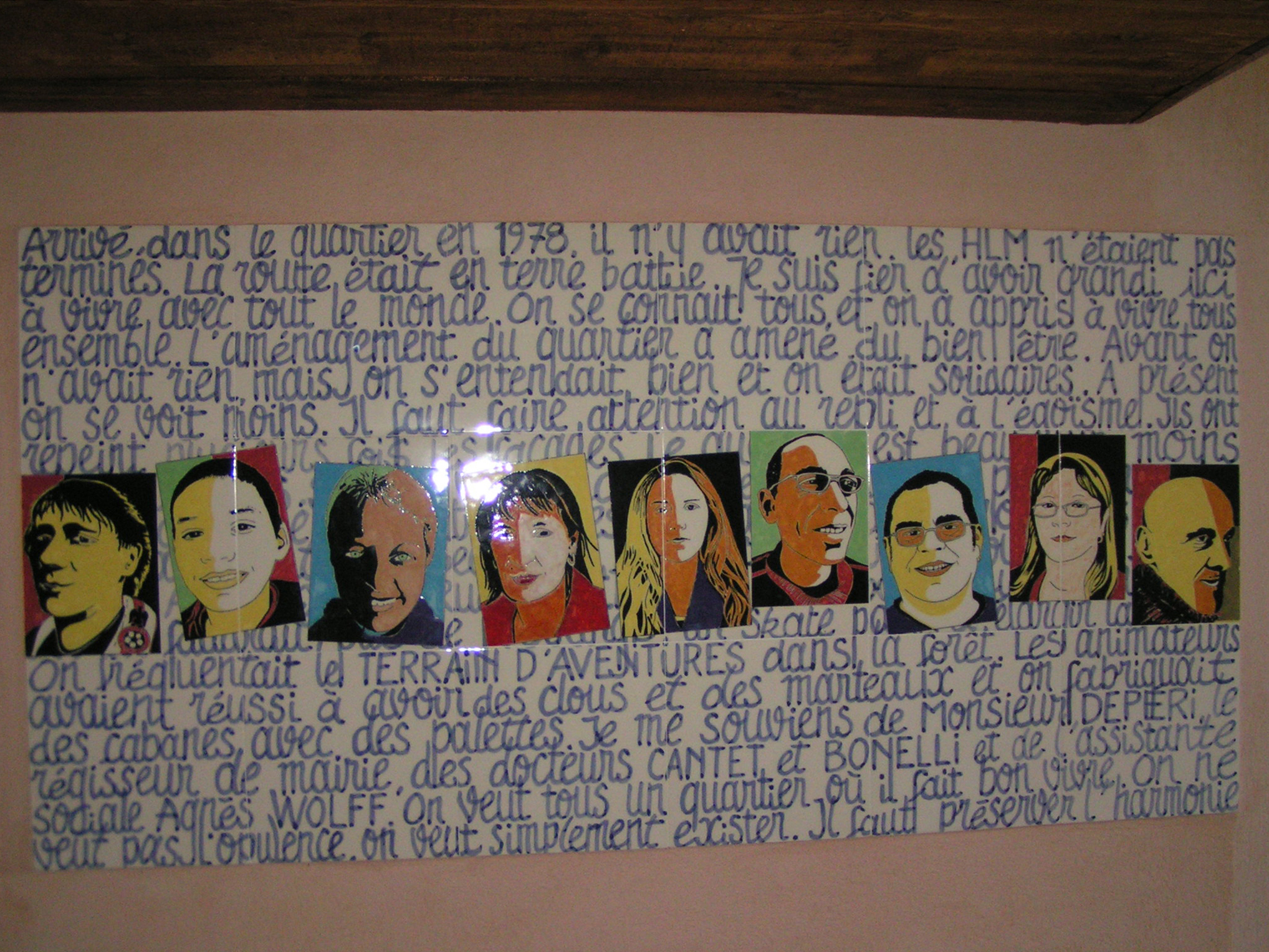 Dominique : Plusieurs fêtes ont ponctué les trois mois du projet rajoutant de la convivialité. J'ai offert à chaque habitant son portrait sur papier. J'ai remarqué une certaine fierté de se voir reproduit aux regards de tous. Je me suis attaché à faire valoir une image valorisante d'eux-mêmes. Je me suis attaché à ce qu'ils se reconnaissent et chacun a reconnu chacun. Le samedi matin sur le marché les habitants des autres immeubles ou des autres quartiers me demandaient quand j'interviendrai chez eux. Ce projet a renforcé le fort sentiment d'appartenance. Ils étaient émus de se voir « pour la vie » comme ils disaient sur les murs de leur immeuble.